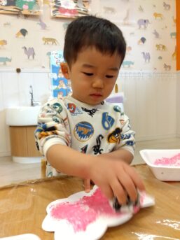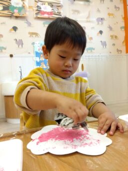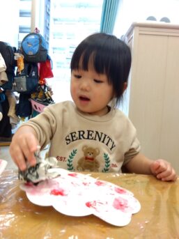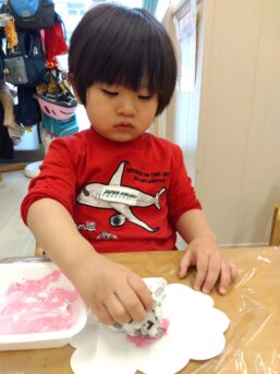 桜のスタンプでは丸めた新聞紙に絵の具を付けながら