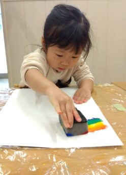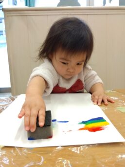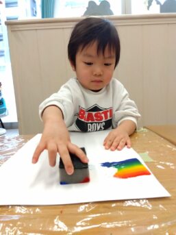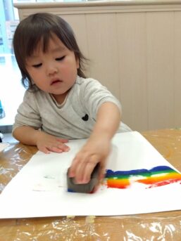 虹のスタンプでは絵の具を付けたスポンジを慎重に横に動かし