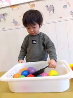 フライパンでボールをすくうことを楽しんだりと