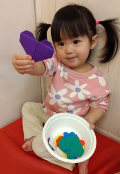 保育園では、バレンタインデーにちなんでハート型おりがみで様々な色に触れながら遊んでみました🎶