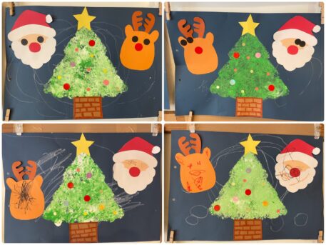 壁面制作もクレヨンや絵の具を使ってクリスマスツリーを