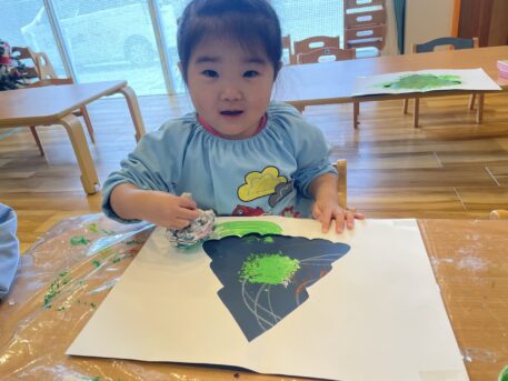 壁面制作もクレヨンや絵の具を使ってクリスマスツリーを