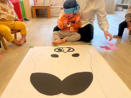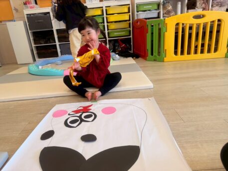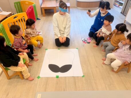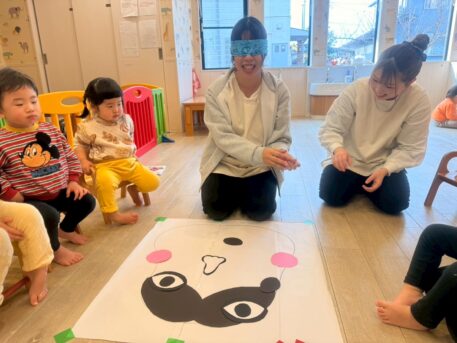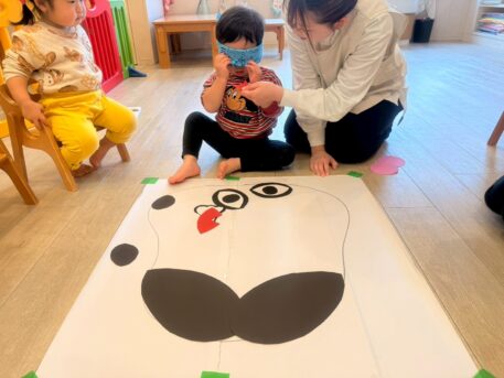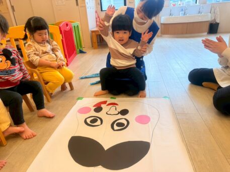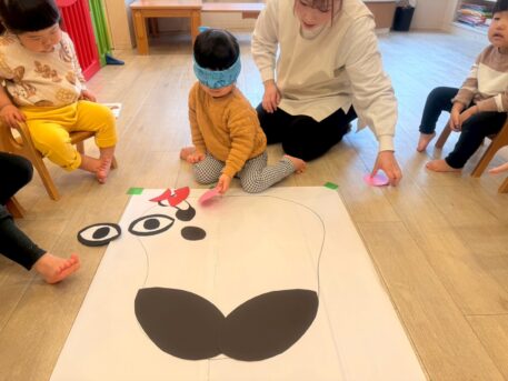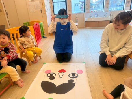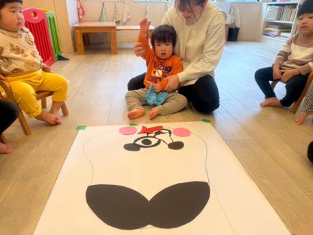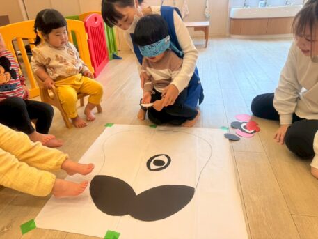 先日、うさぎ組(2歳児クラス)とりす組(1歳児クラス)で日本の伝承遊び、福笑いをして遊びました!