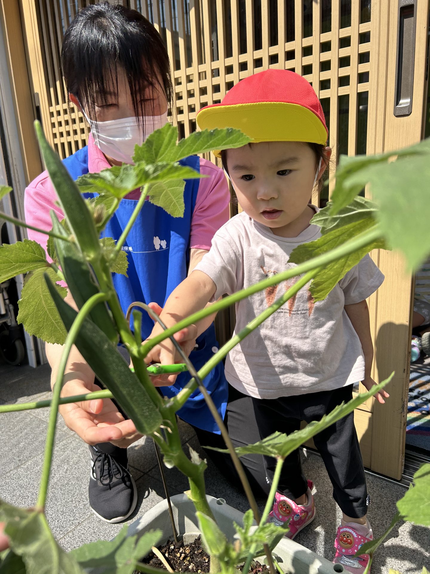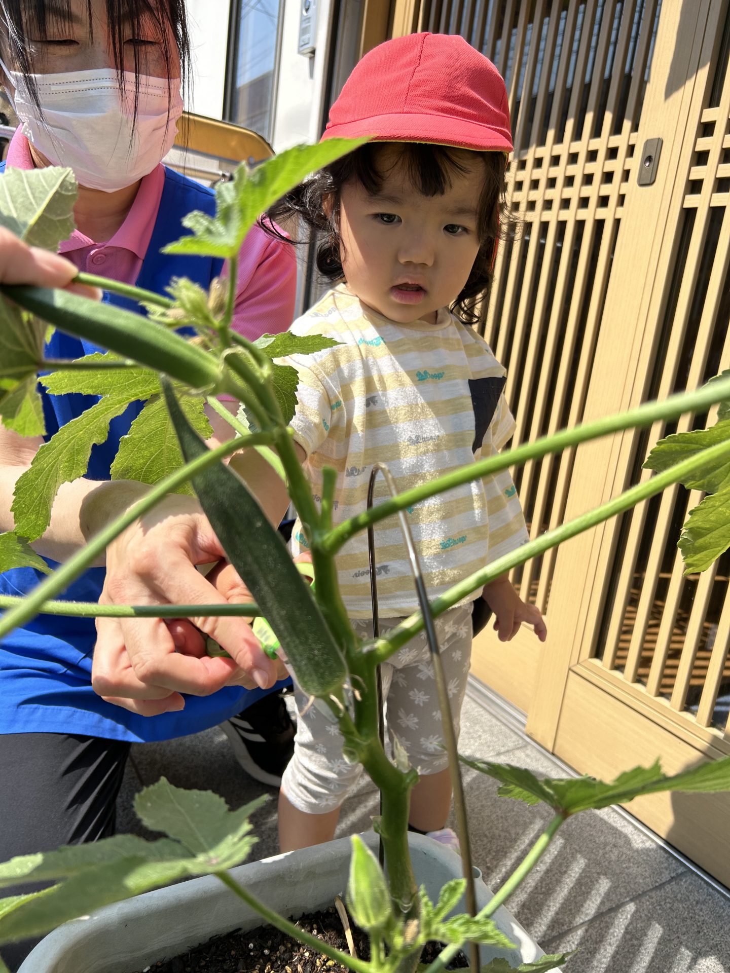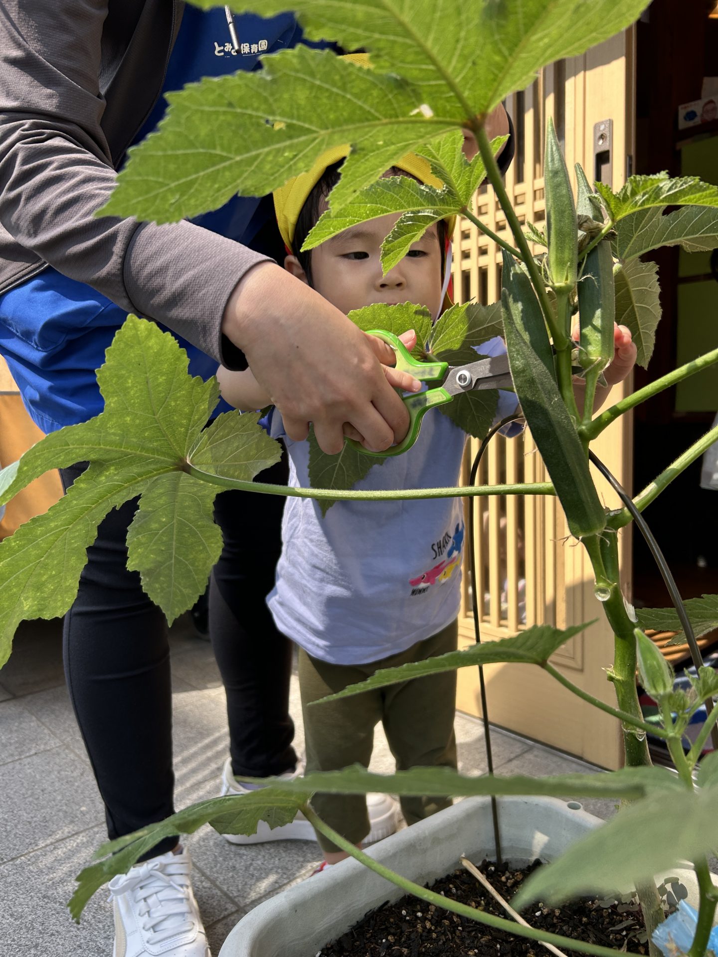 みんなで植えたオクラも沢山出来てきたので、きりん組のみんなで収穫もしました😊
