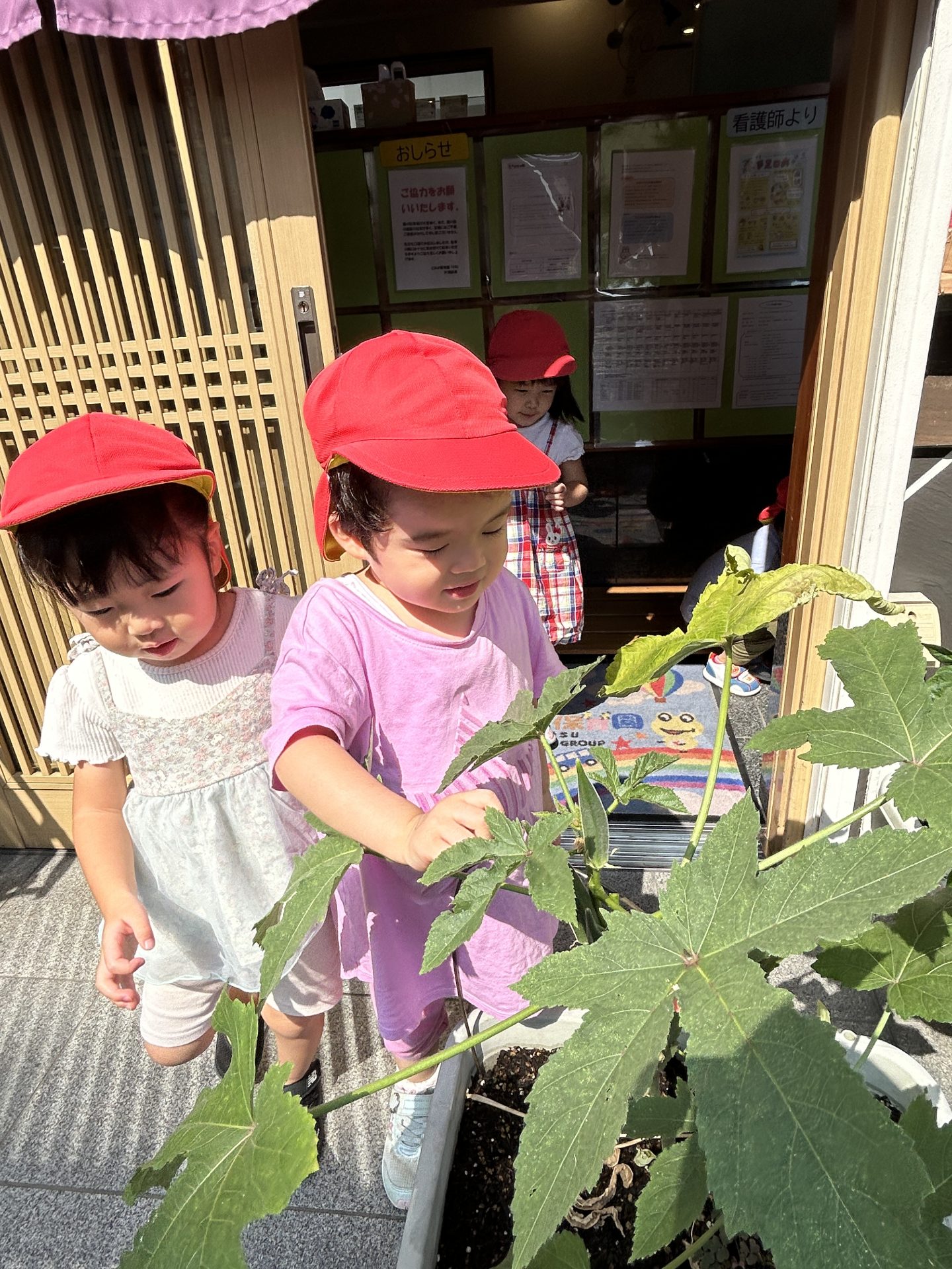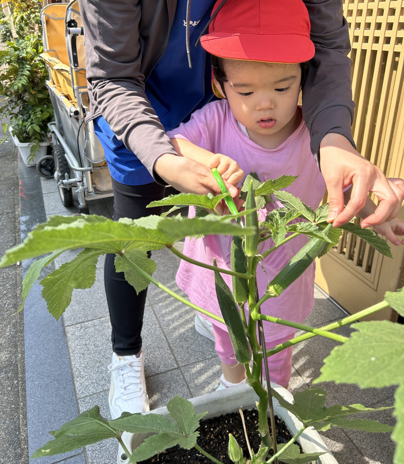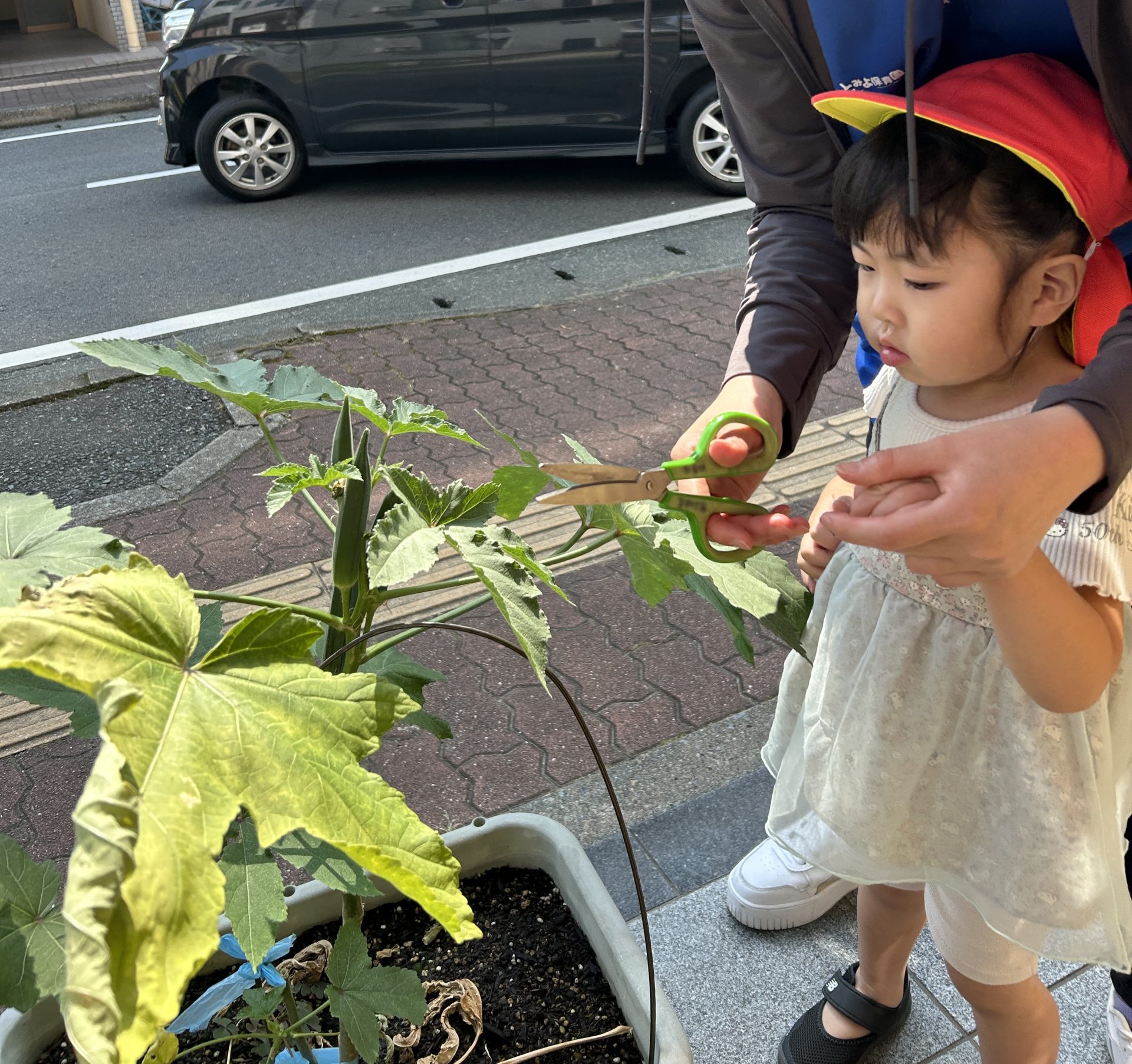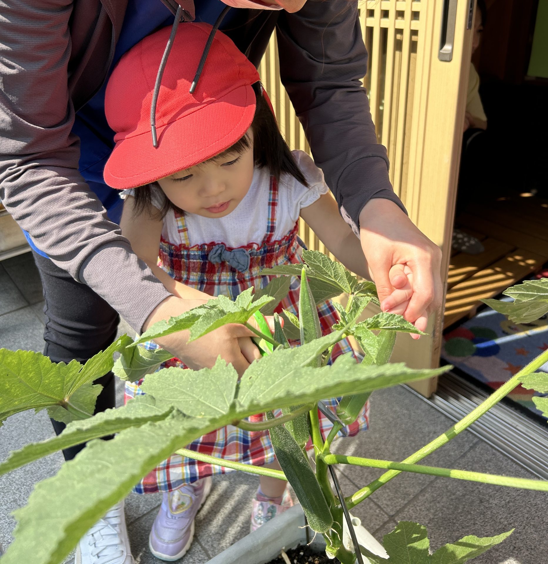 みんなで植えたオクラも沢山出来てきたので、きりん組のみんなで収穫もしました😊