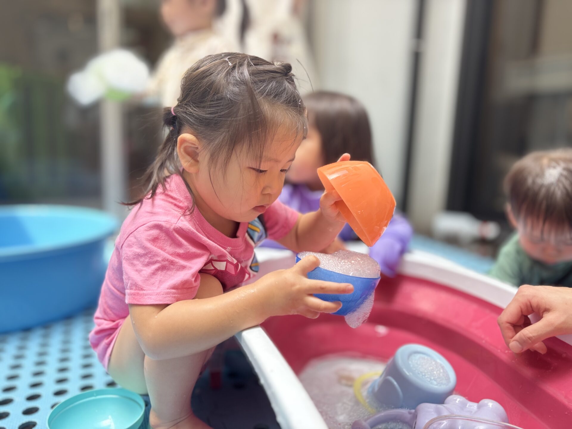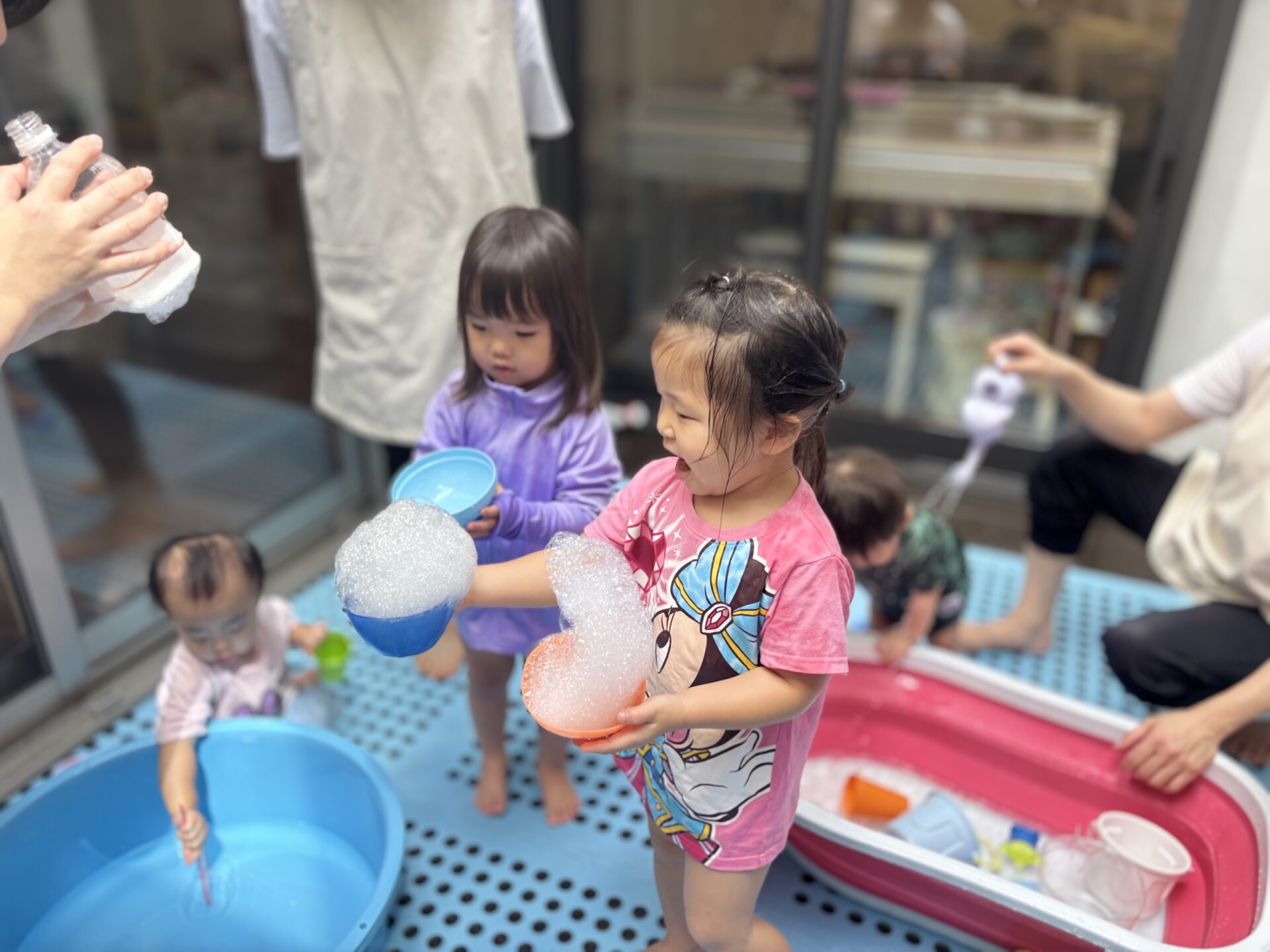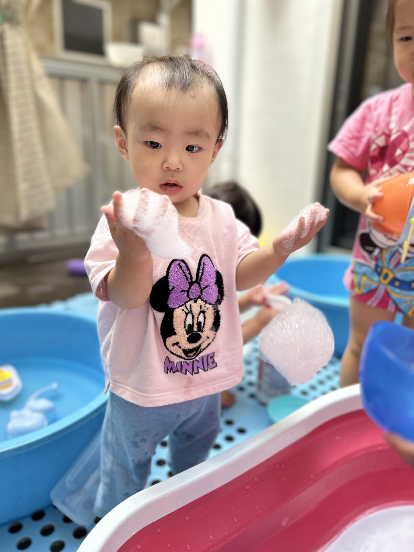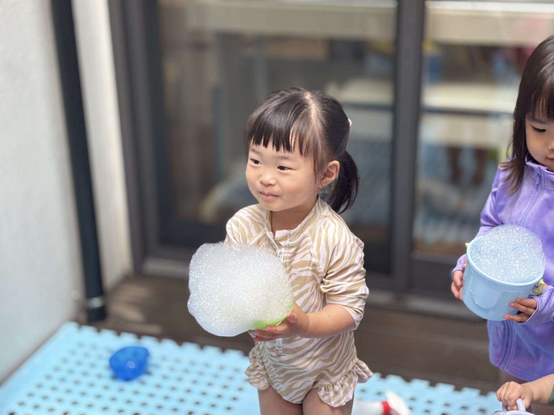 テラスでは水遊びだけではなく、泡遊びも楽しんでいます♪子ども達も泡に興味津々!🫧