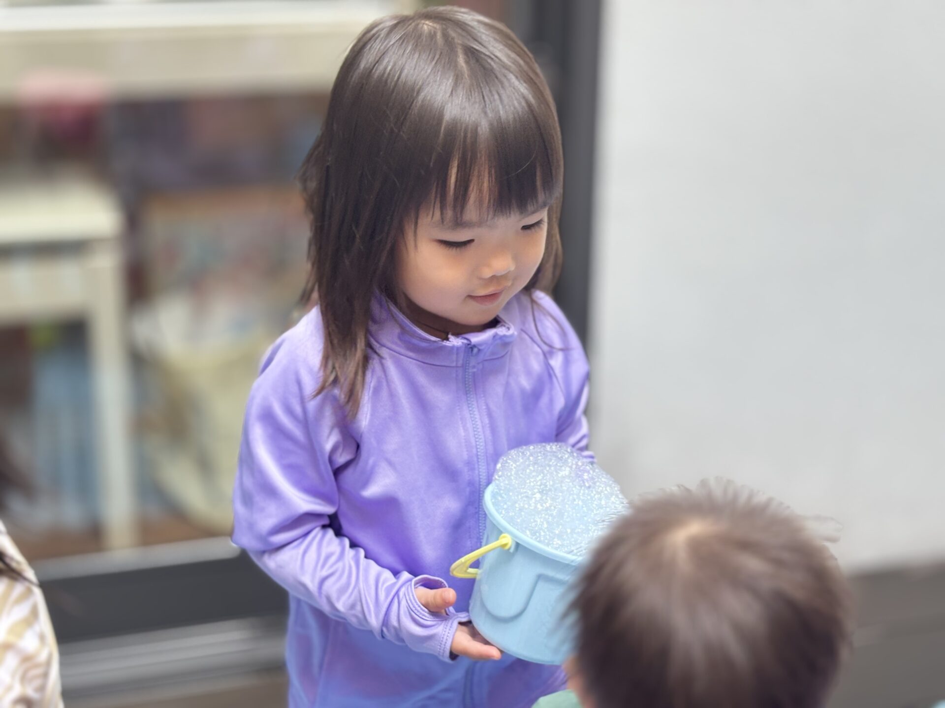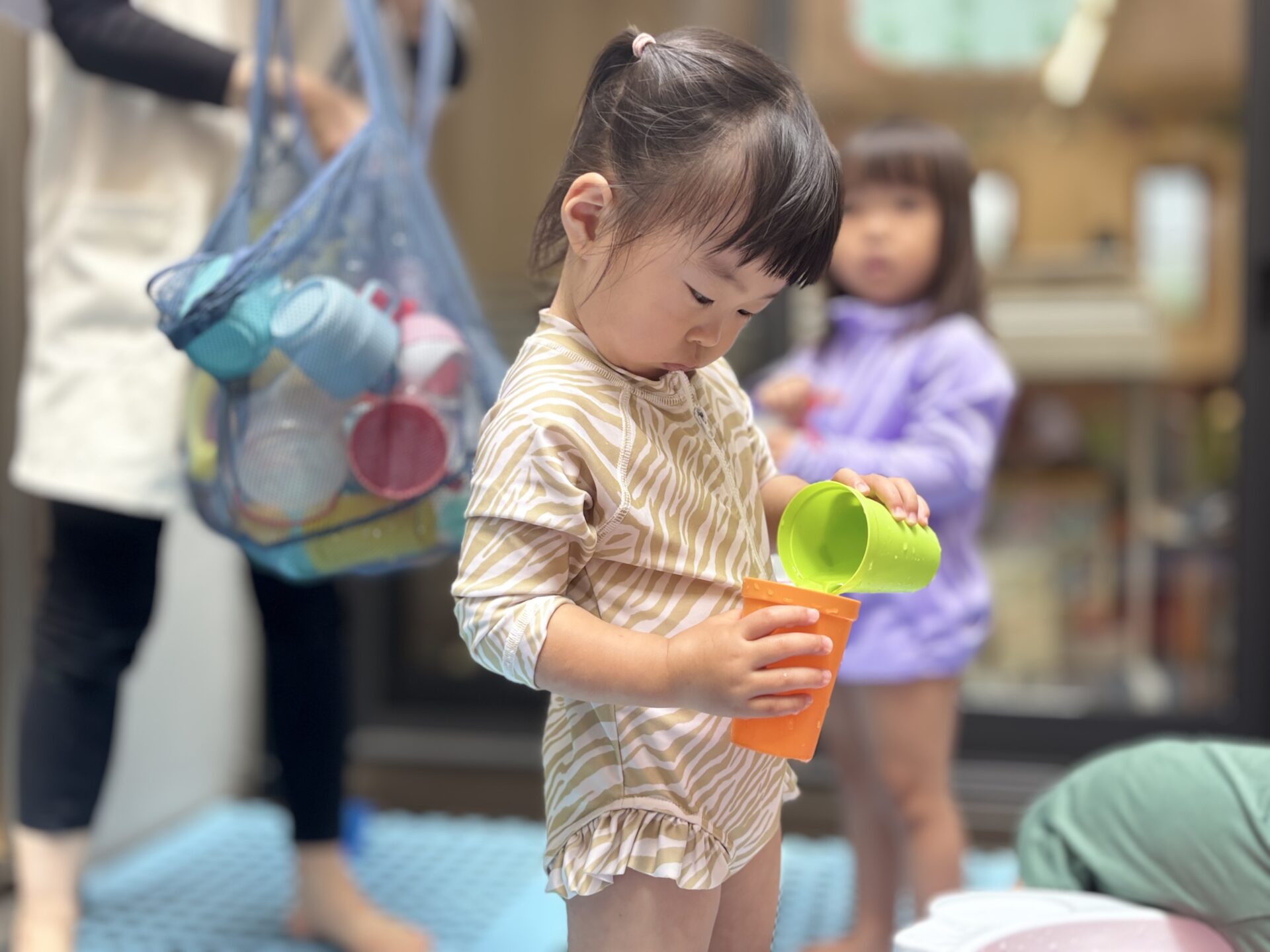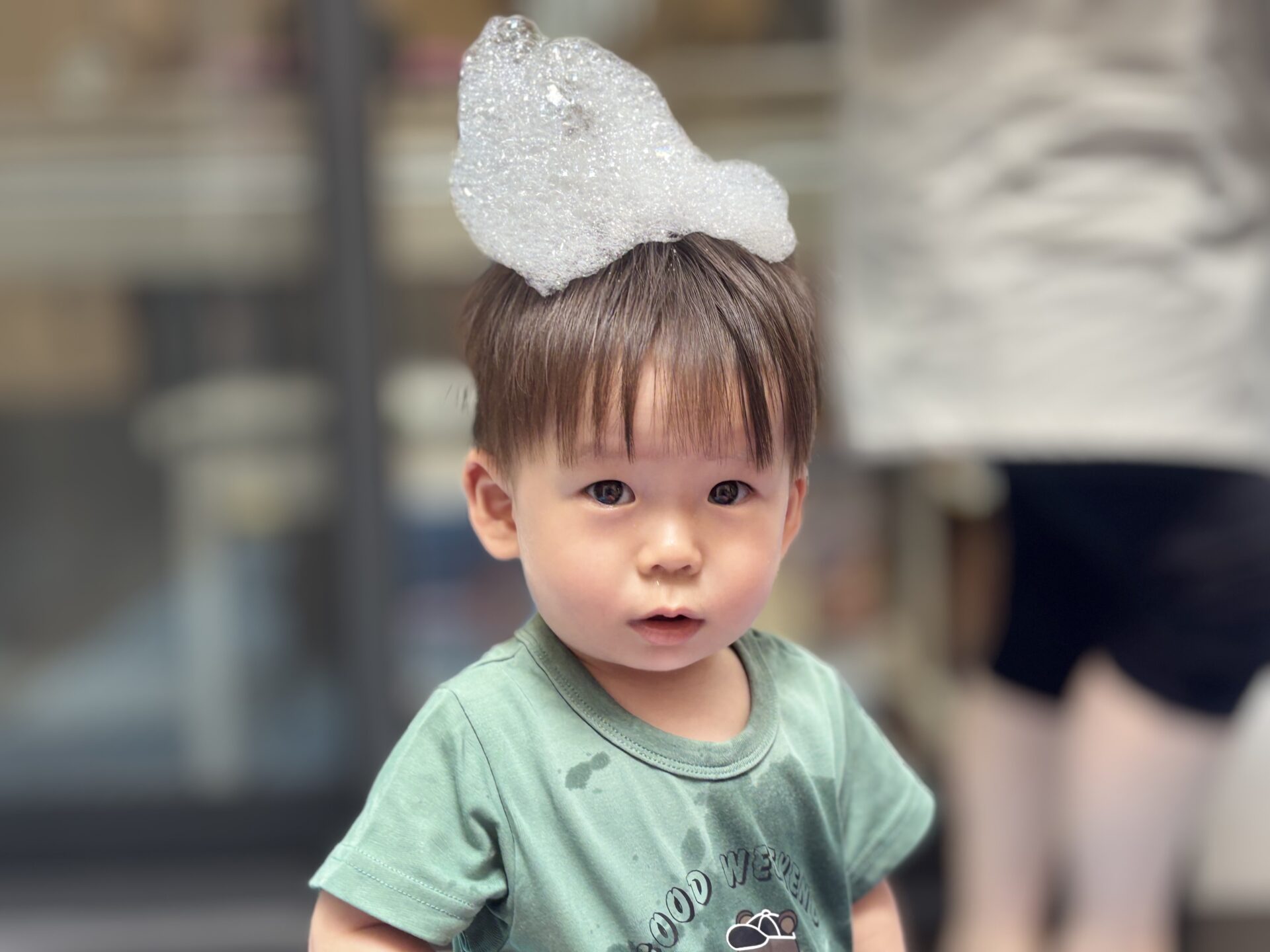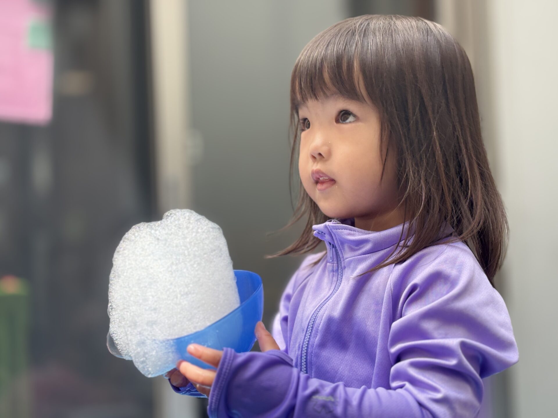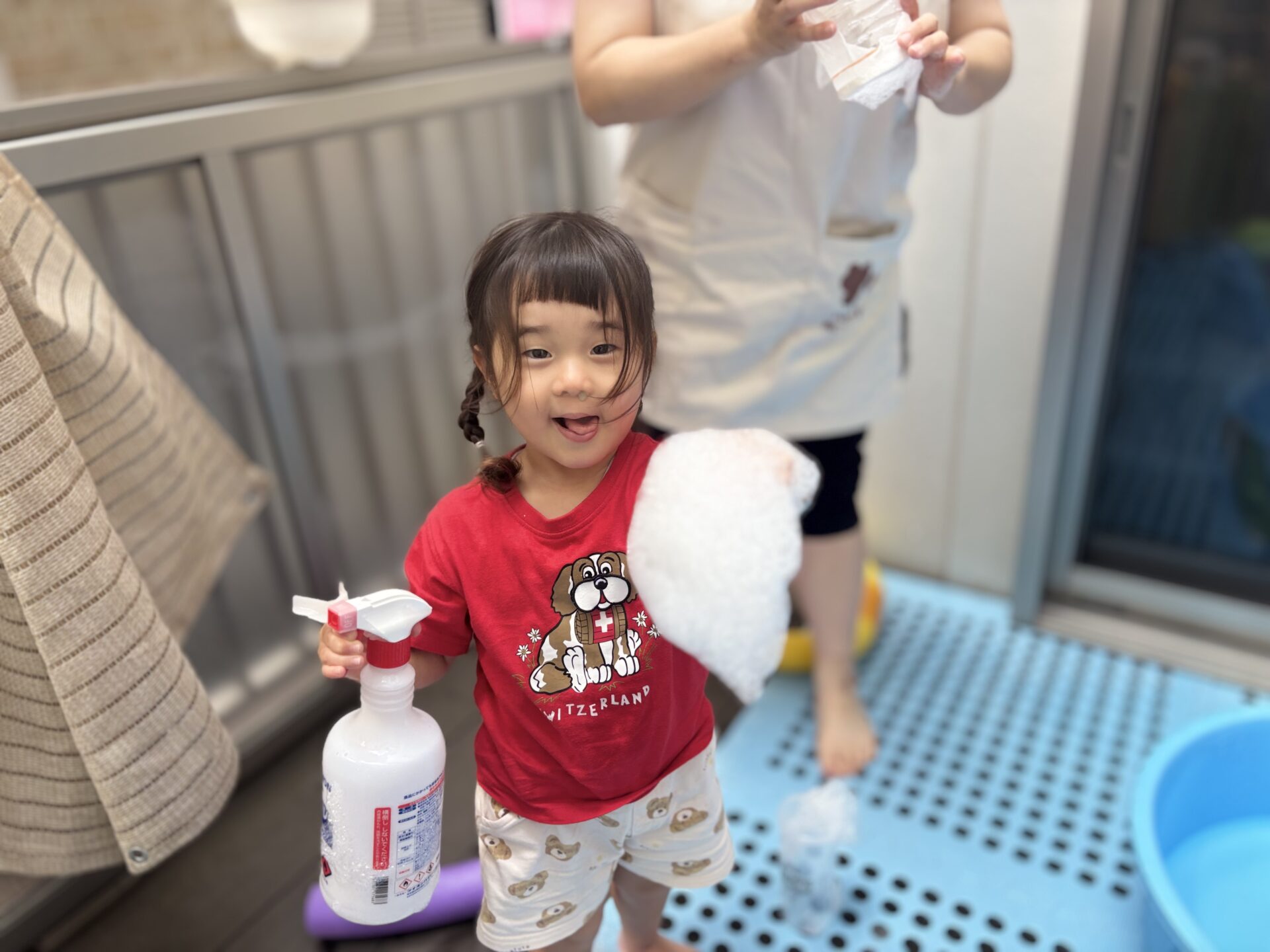 テラスでは水遊びだけではなく、泡遊びも楽しんでいます♪子ども達も泡に興味津々!🫧