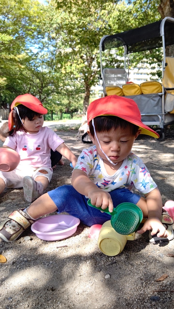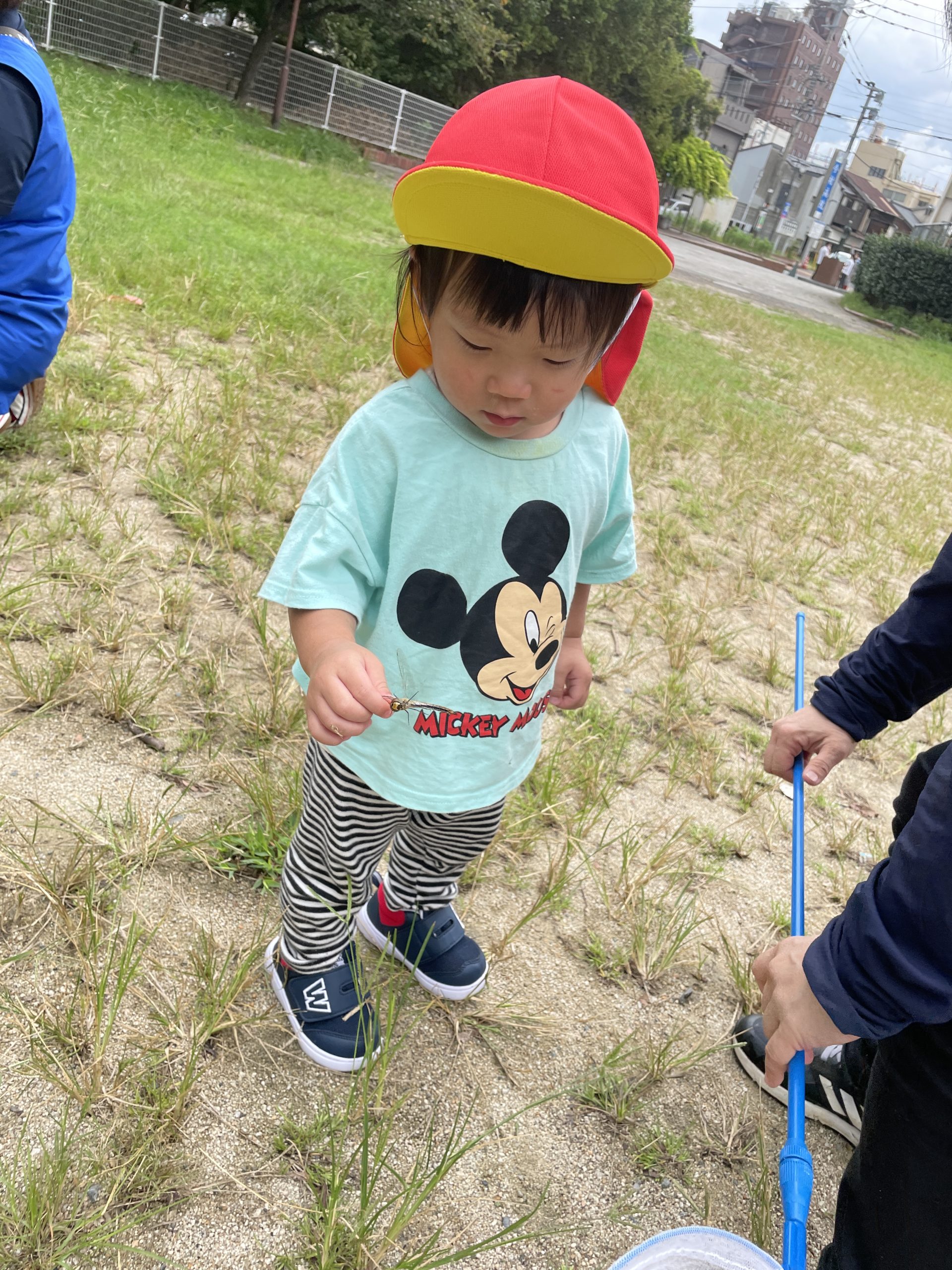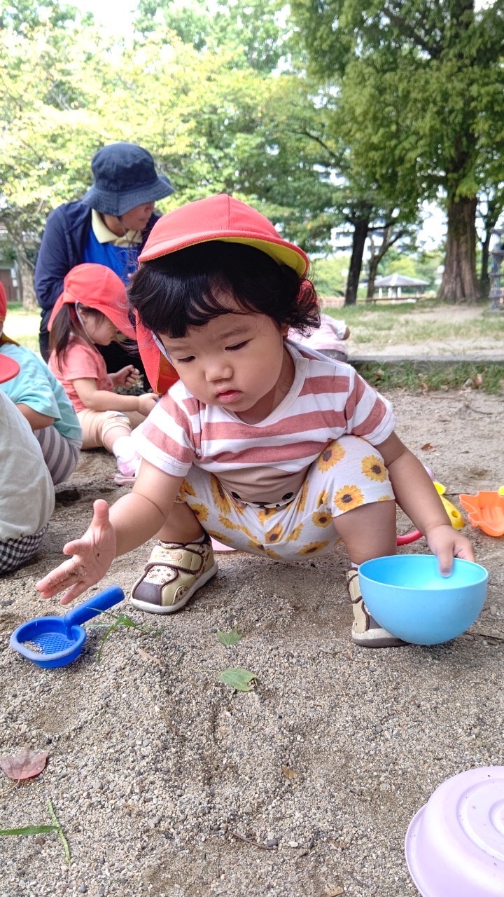日中はまだ汗ばむ日がありますが、中央公園では砂遊びやかけっこ、バッタ探しをして、元気いっぱい遊びました😊