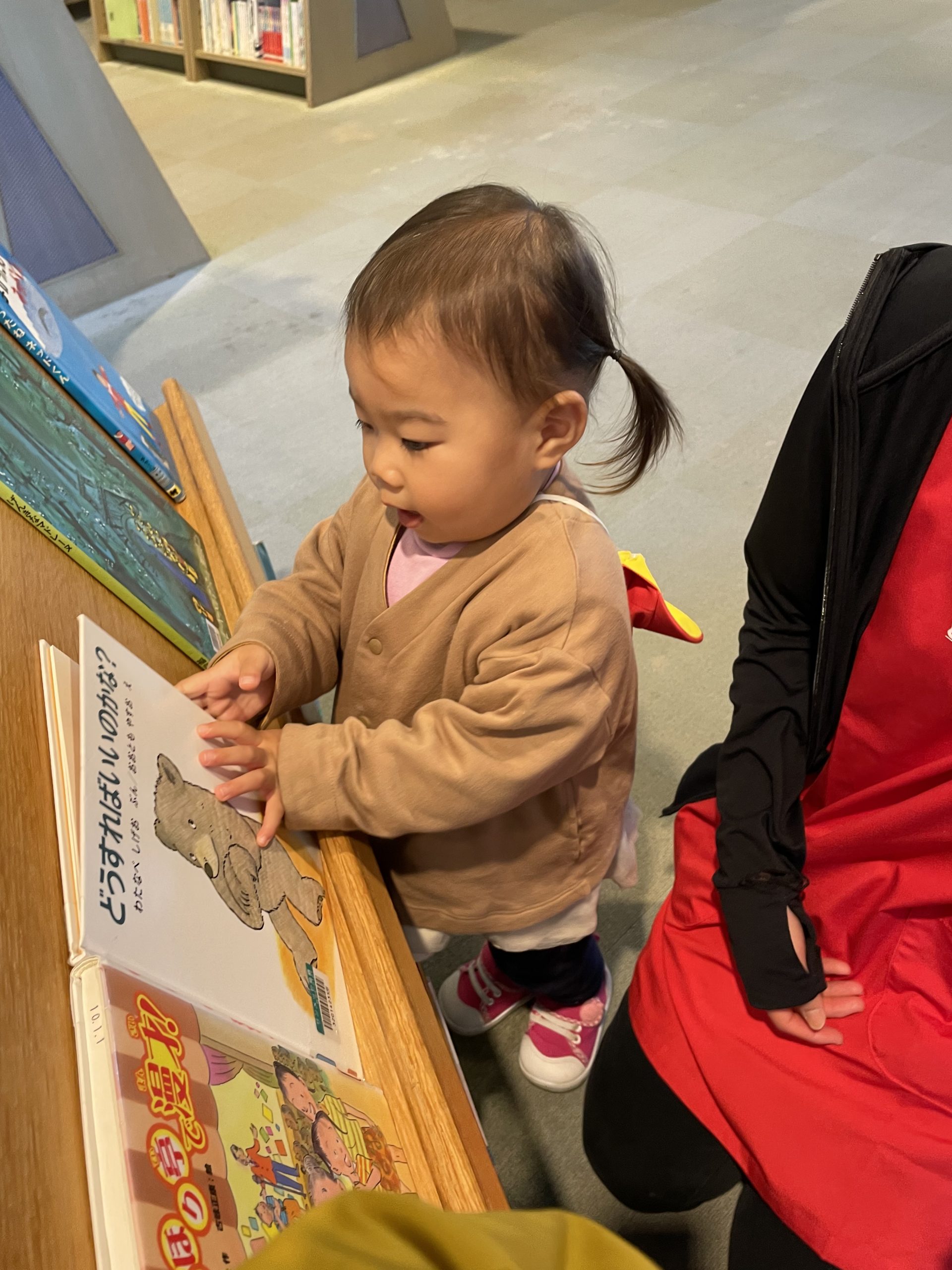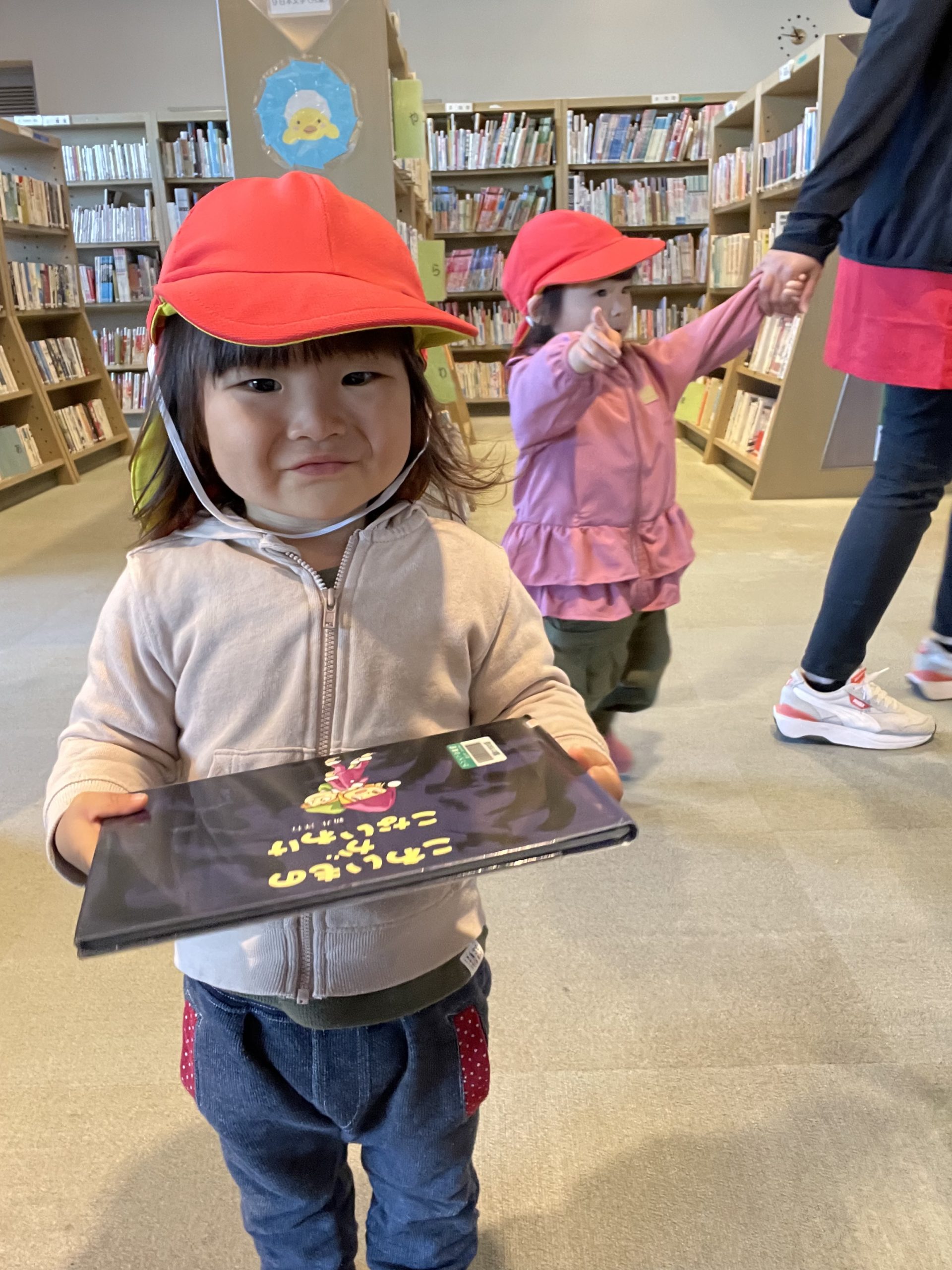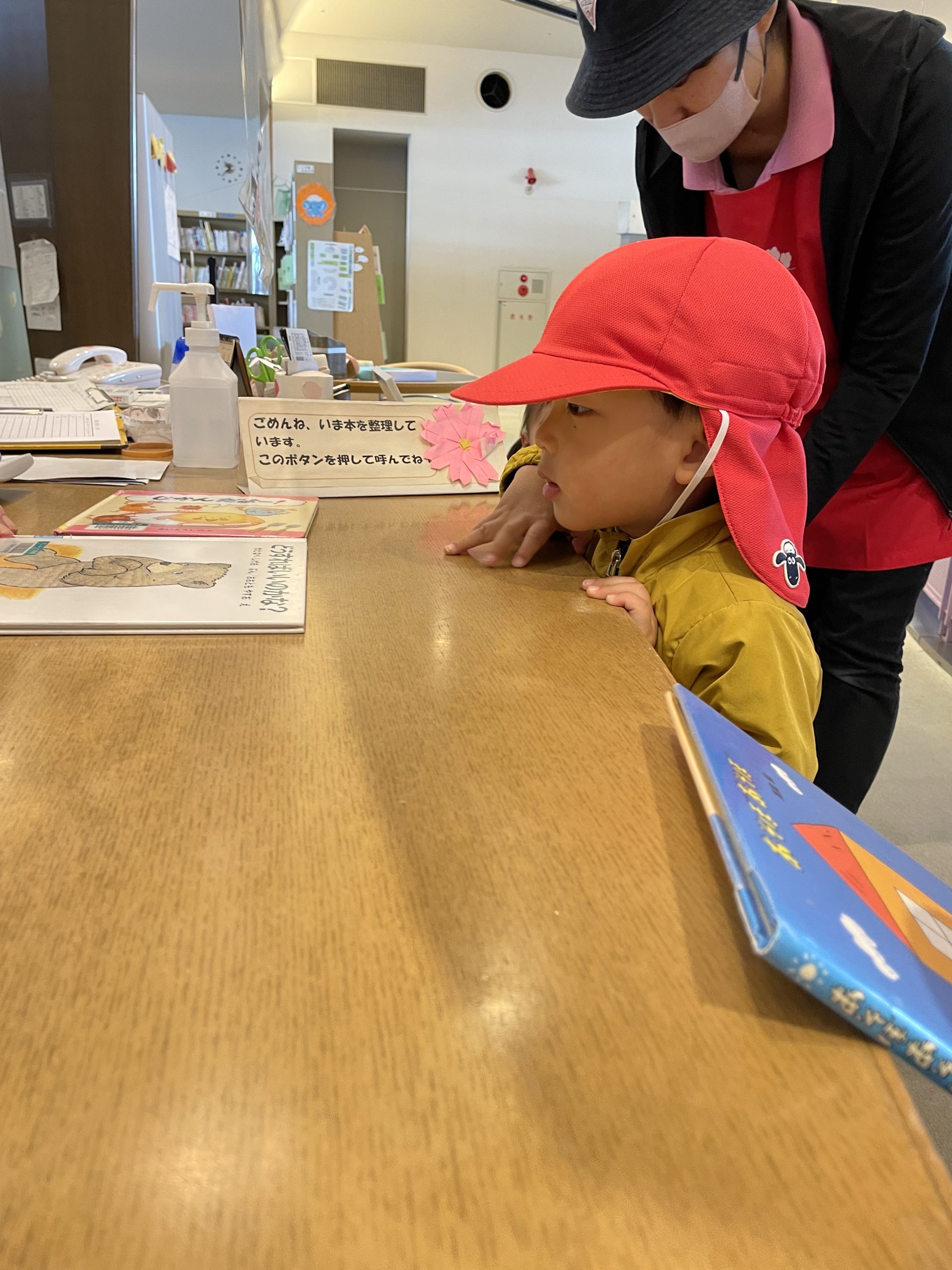 図書館は絵本がいっぱいあるところで、1冊選んで貸してくださいとお願いしに行こうねと話したり、図書館での約束事のお話をしました!