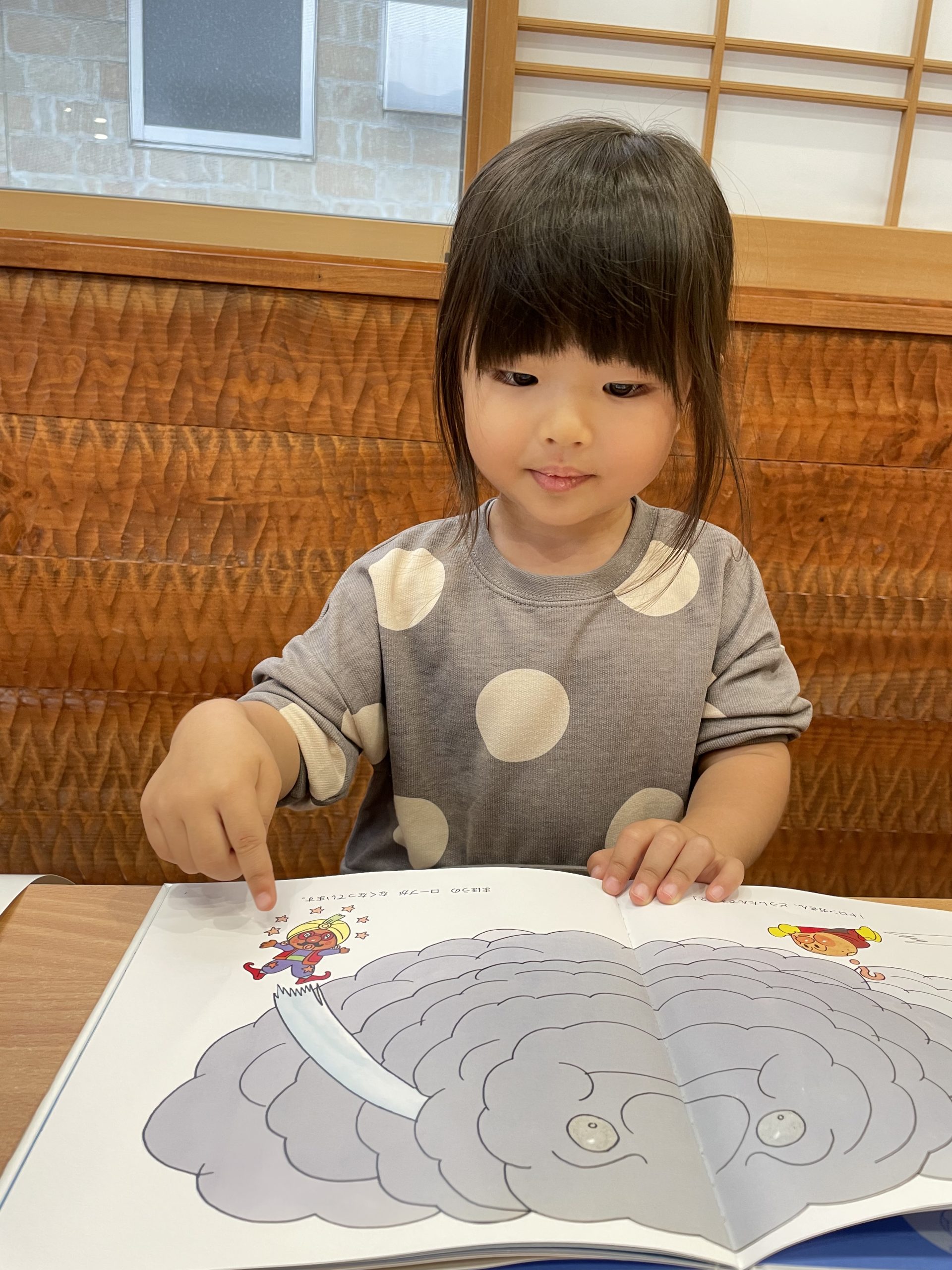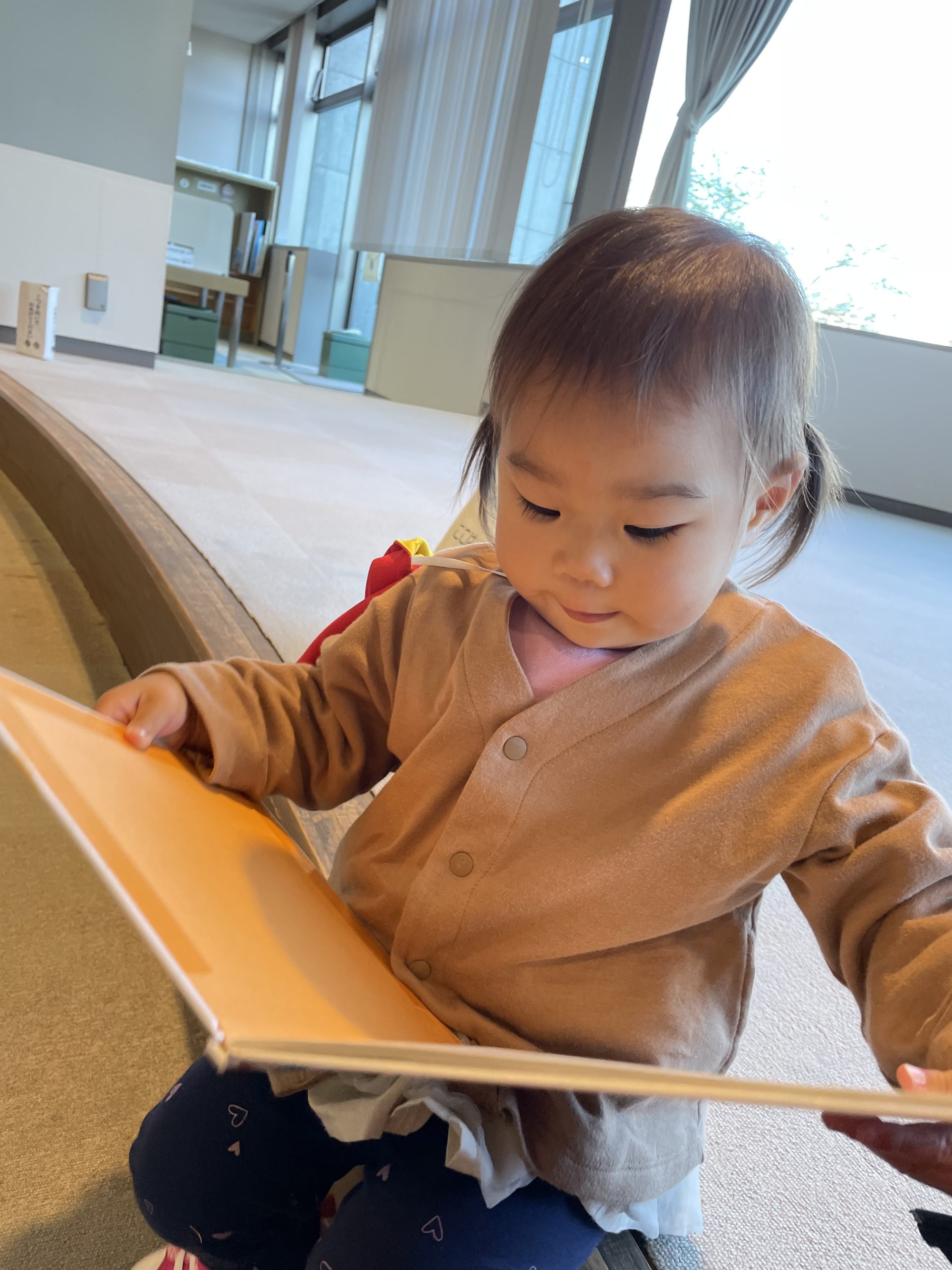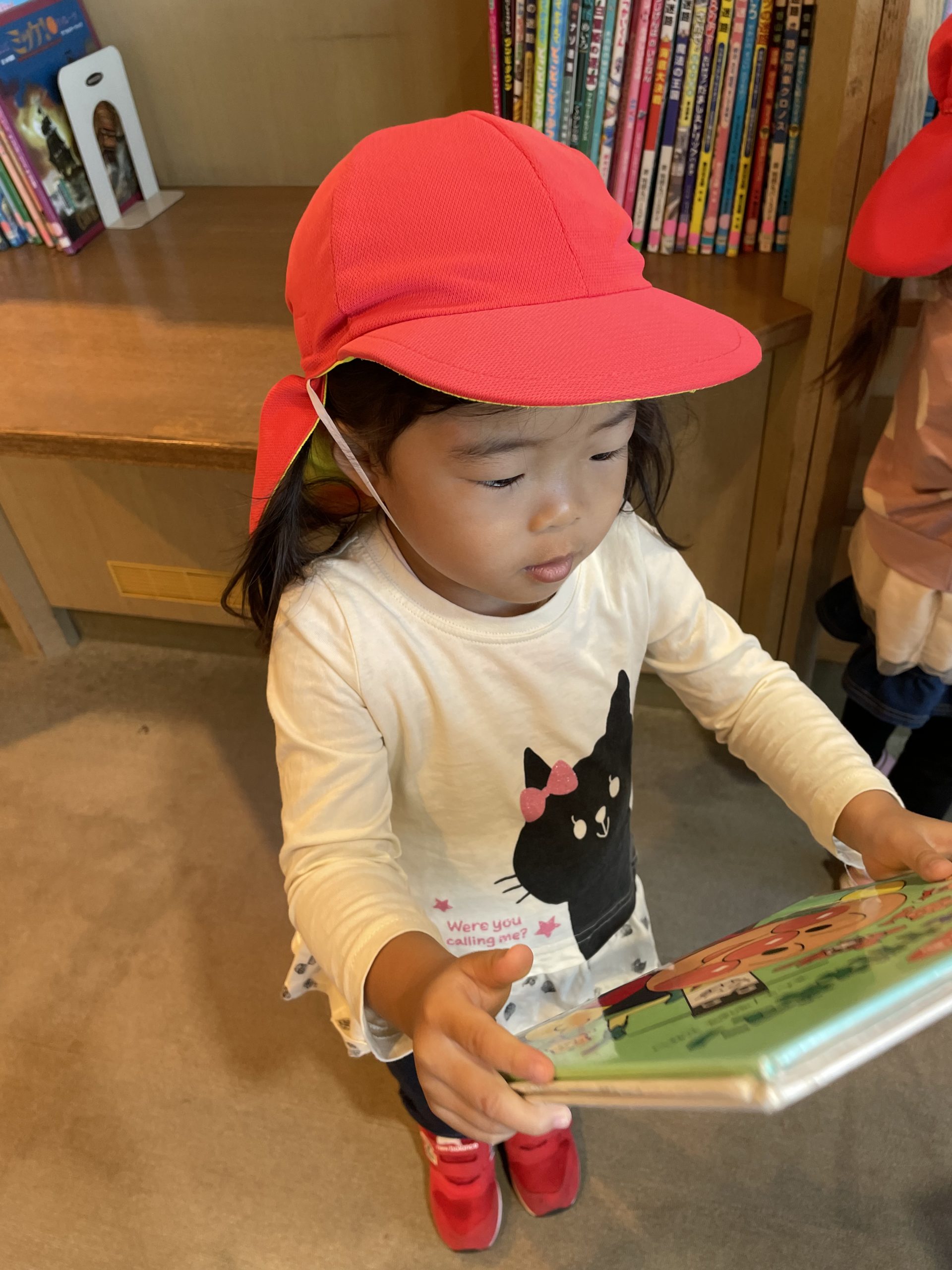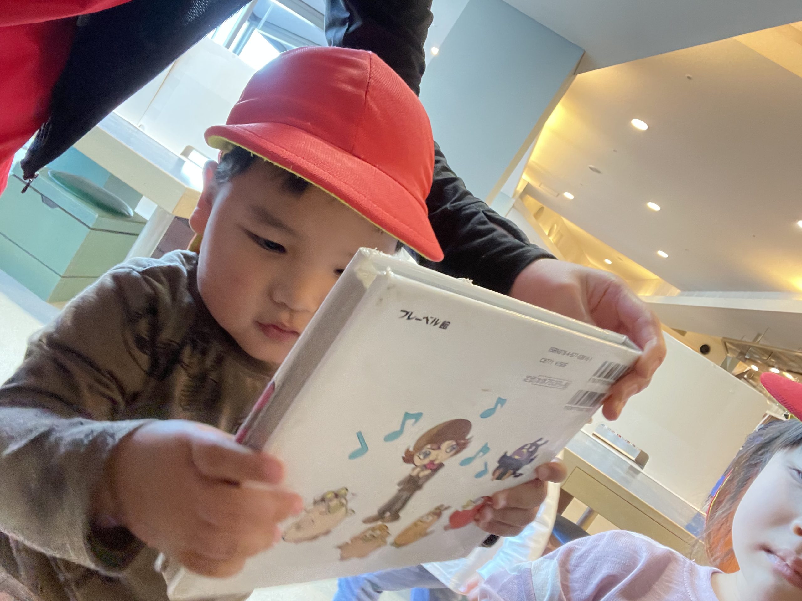 図書館は絵本がいっぱいあるところで、1冊選んで貸してくださいとお願いしに行こうねと話したり、図書館での約束事のお話をしました!