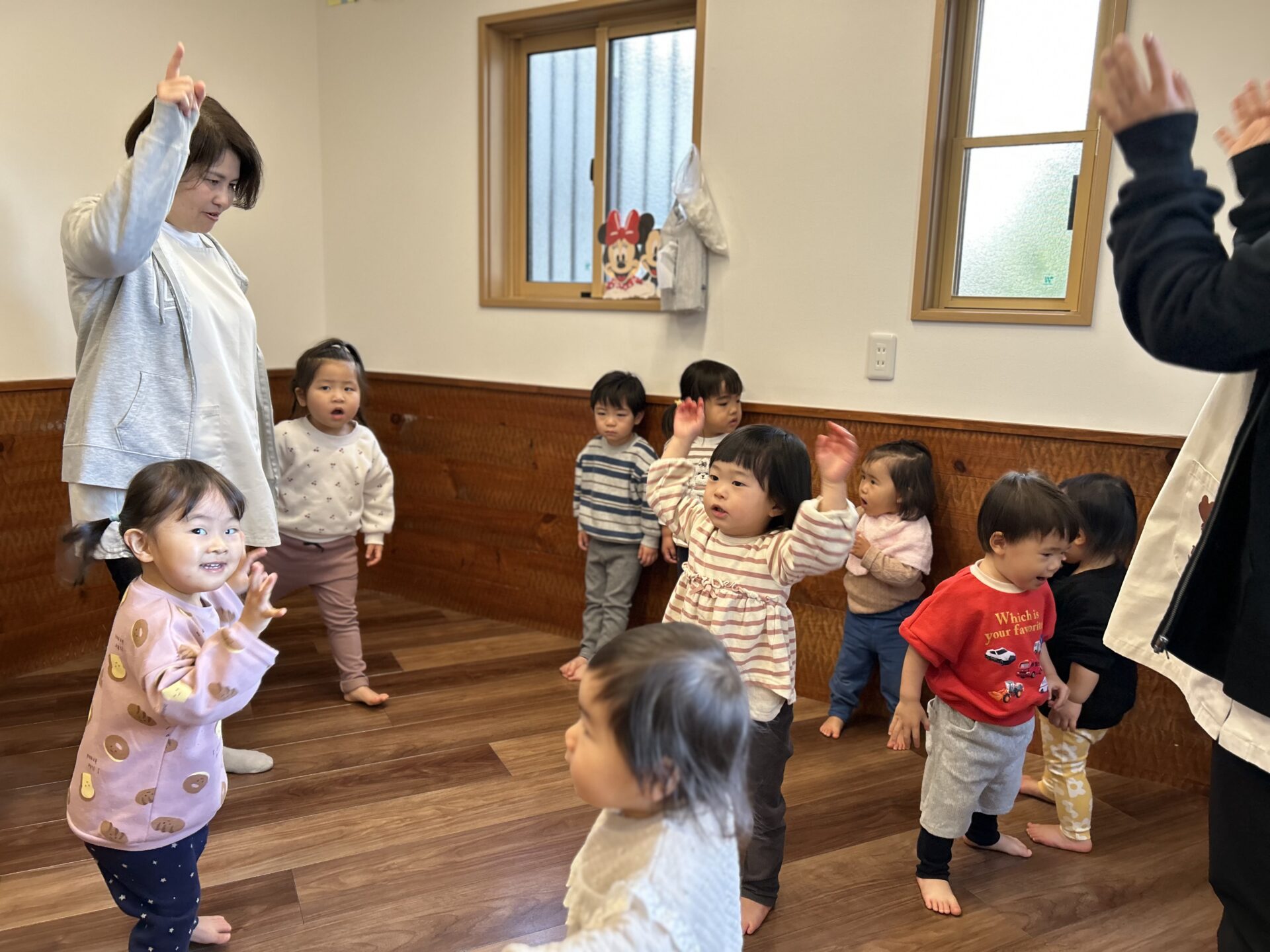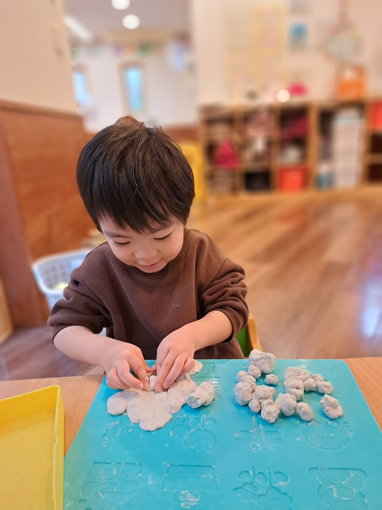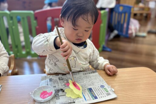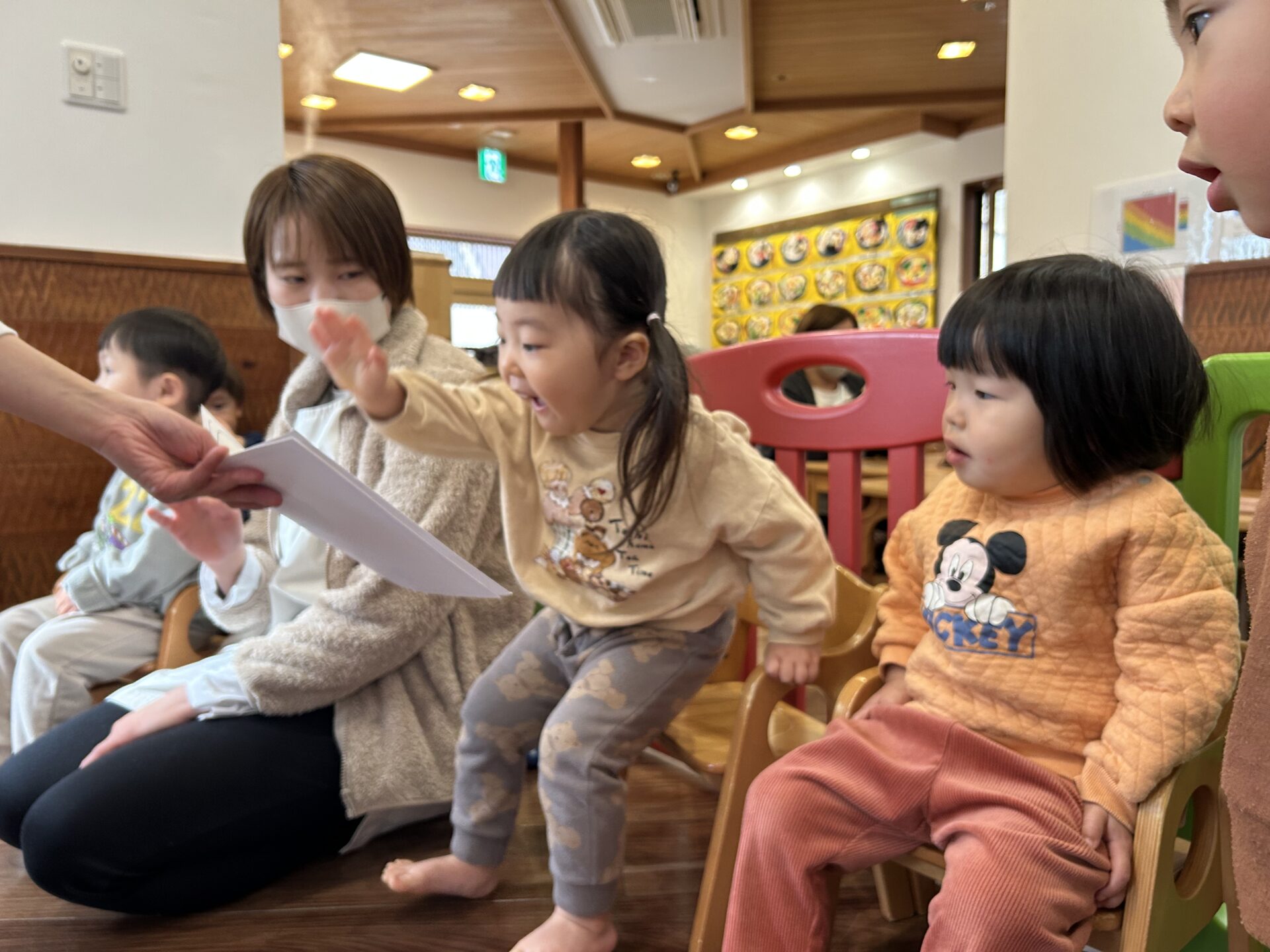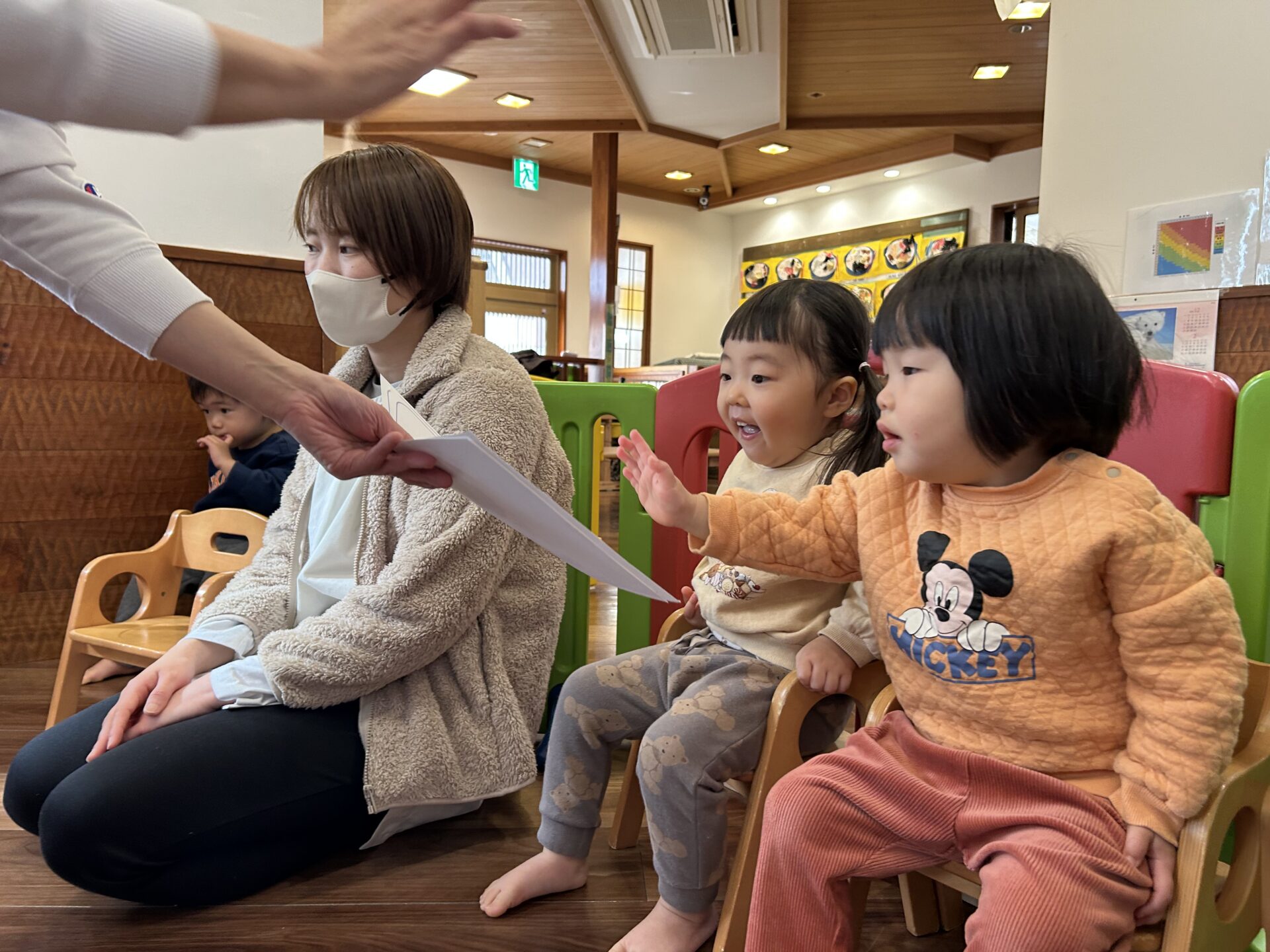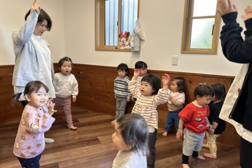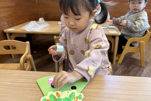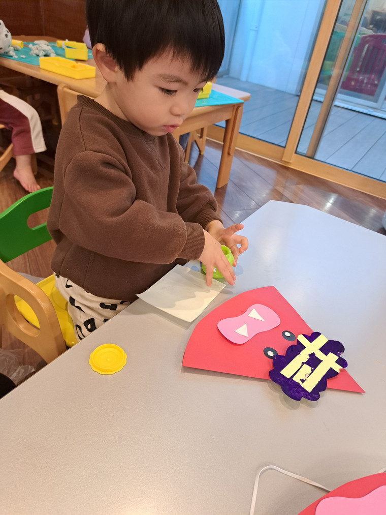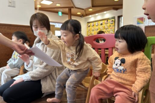 「まめまき」の歌や「おにのパンツ」の体操に合わせてノリノリの子どもたちですが、「鬼さん怖い😱」とか、「鬼さん来る?」と不安そうな顔で聞いてくる時も…👹「病気の鬼、おこりんぼ鬼、泣き虫鬼を追い払い、元気で笑顔の福の神がやって来るように」と節分の話をしています😊手作りの鬼の帽子を被って「鬼は外」「福は内」と元気いっぱい節分を楽しみます✨