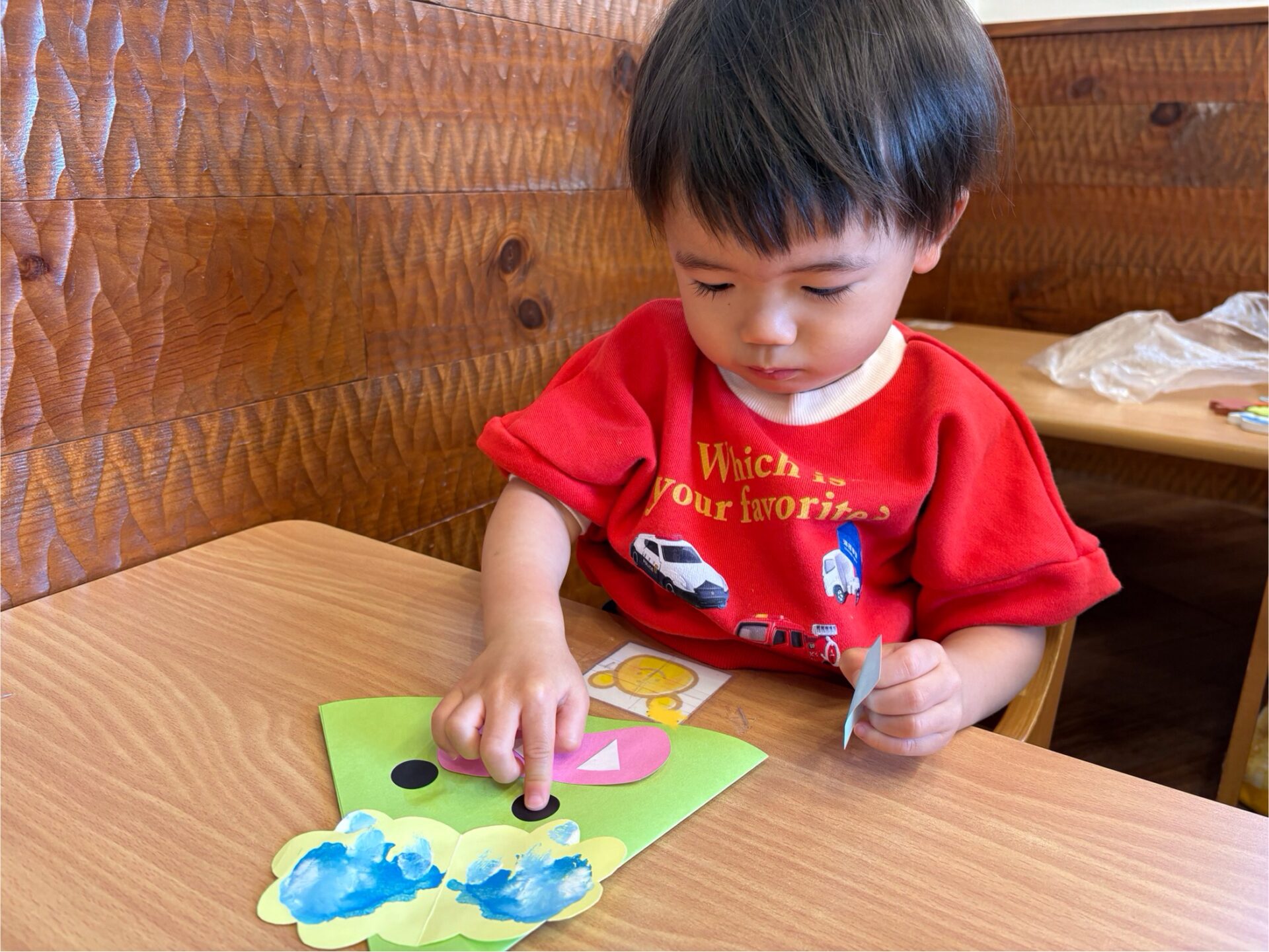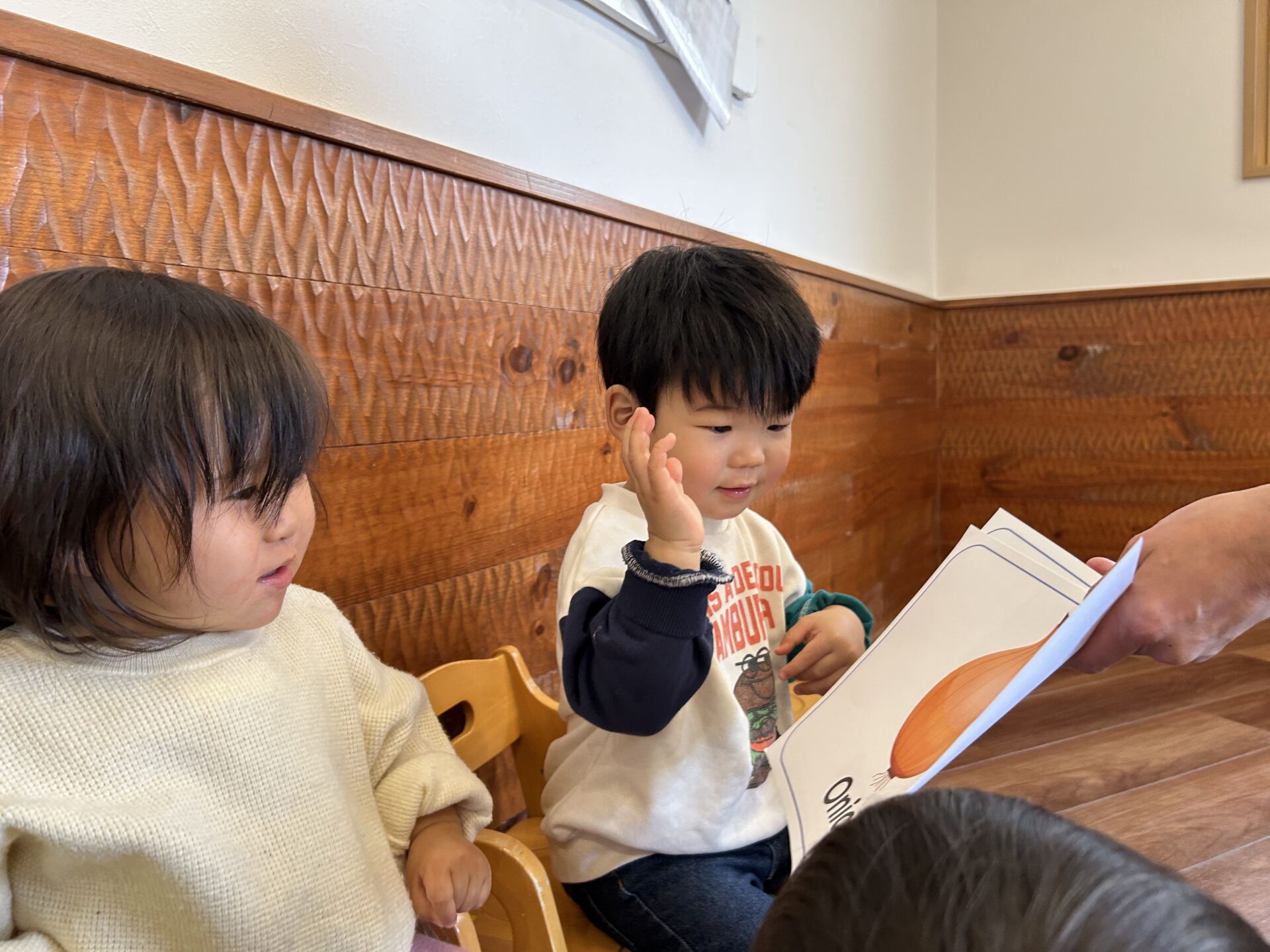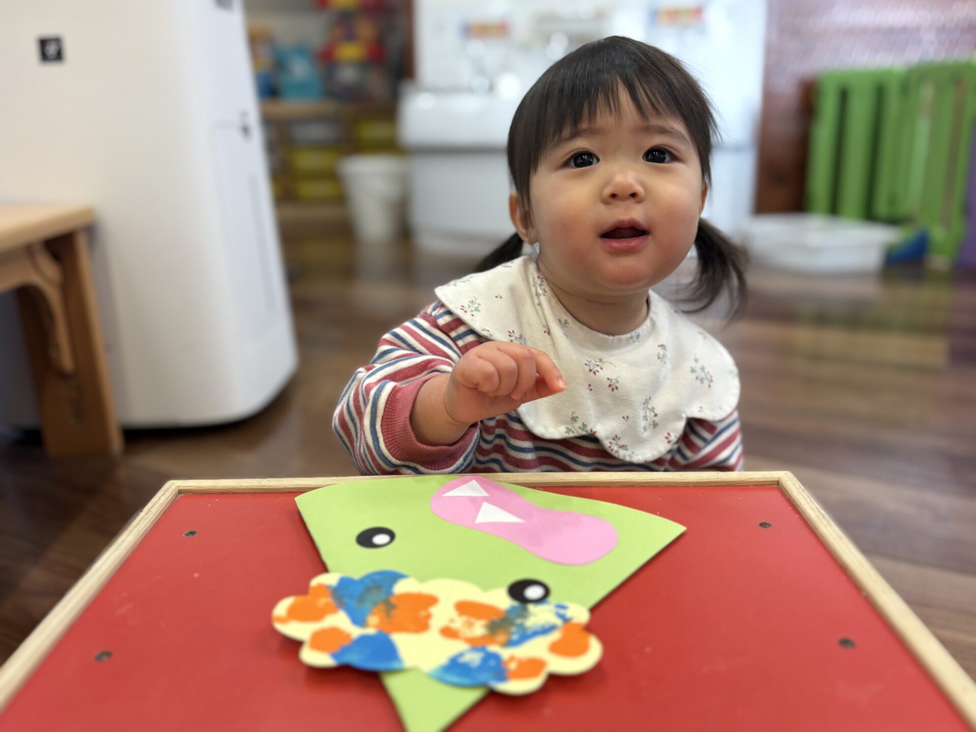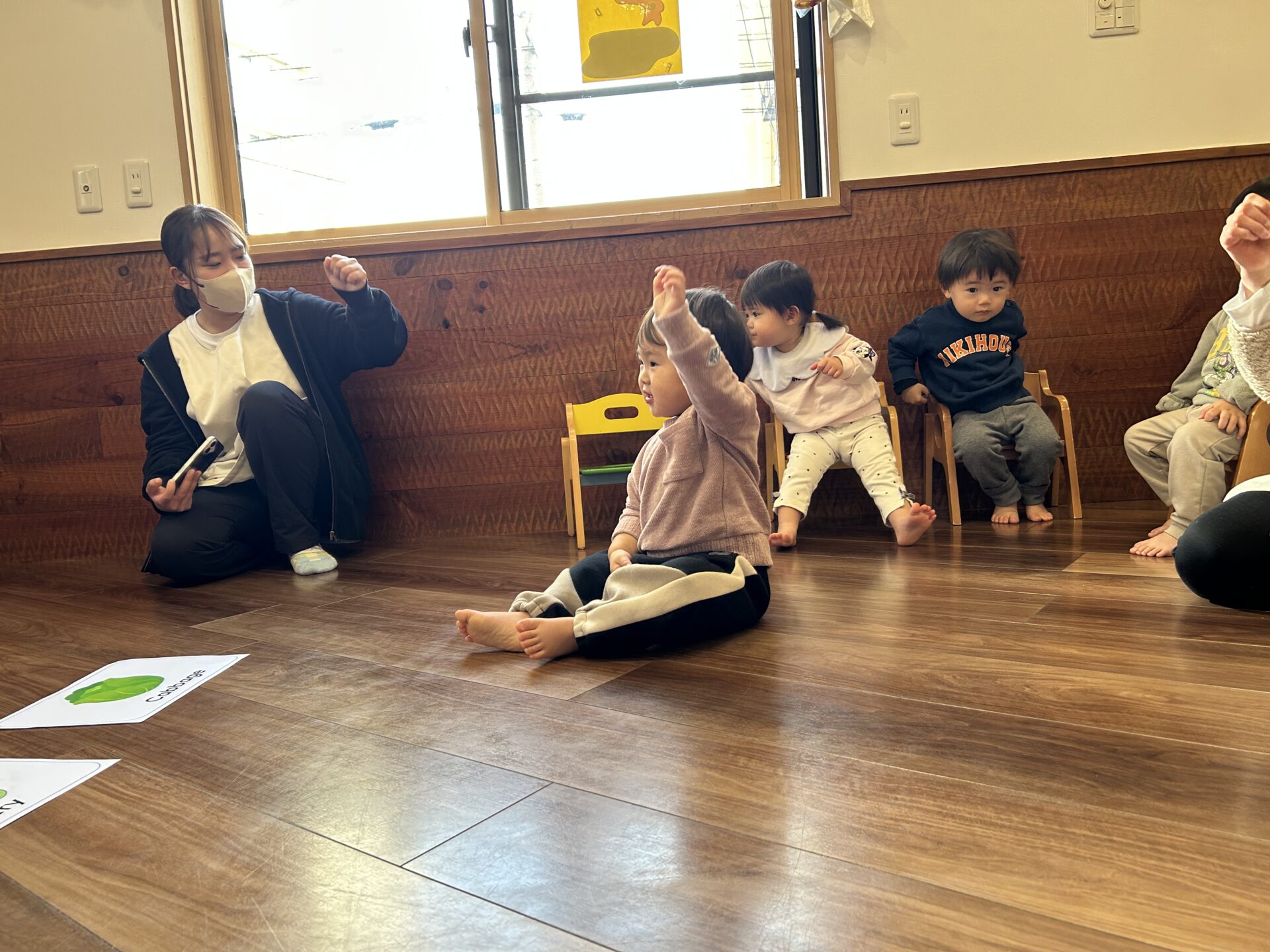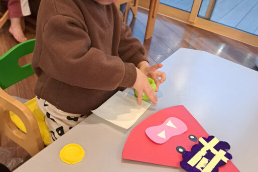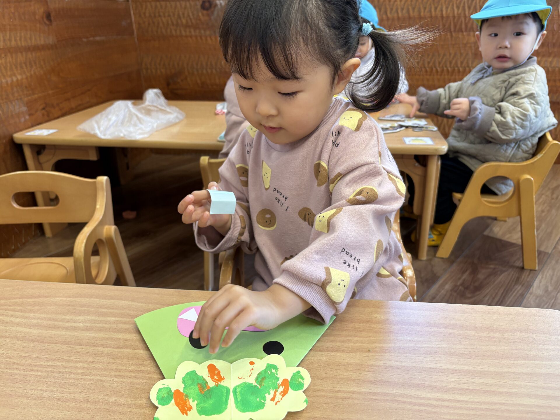 「まめまき」の歌や「おにのパンツ」の体操に合わせてノリノリの子どもたちですが、「鬼さん怖い😱」とか、「鬼さん来る?」と不安そうな顔で聞いてくる時も…👹「病気の鬼、おこりんぼ鬼、泣き虫鬼を追い払い、元気で笑顔の福の神がやって来るように」と節分の話をしています😊手作りの鬼の帽子を被って「鬼は外」「福は内」と元気いっぱい節分を楽しみます✨
