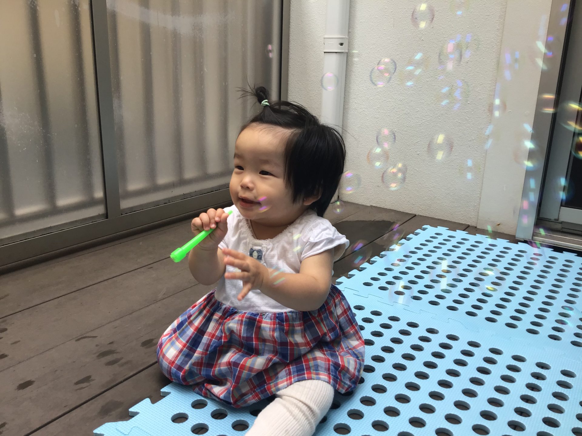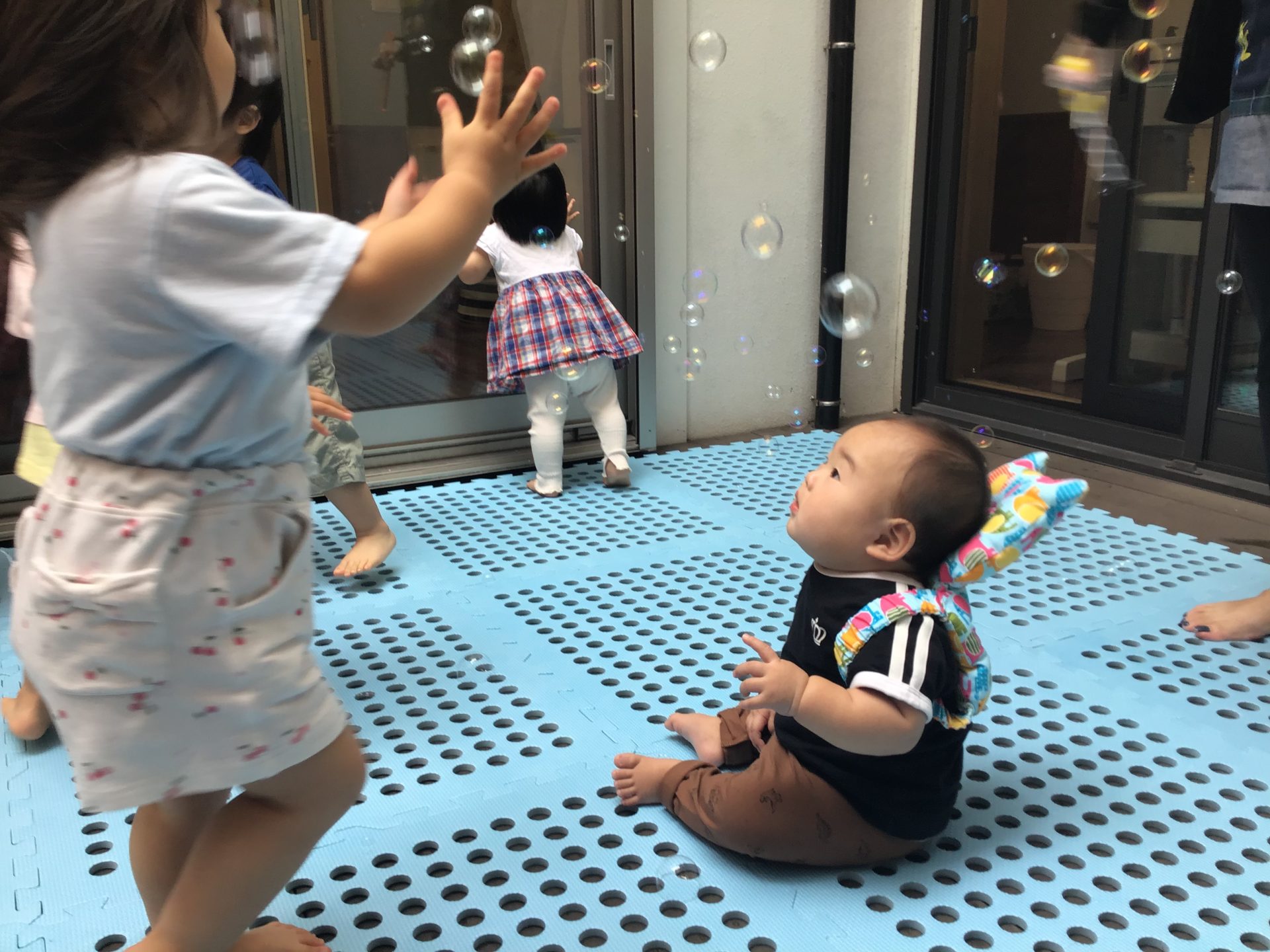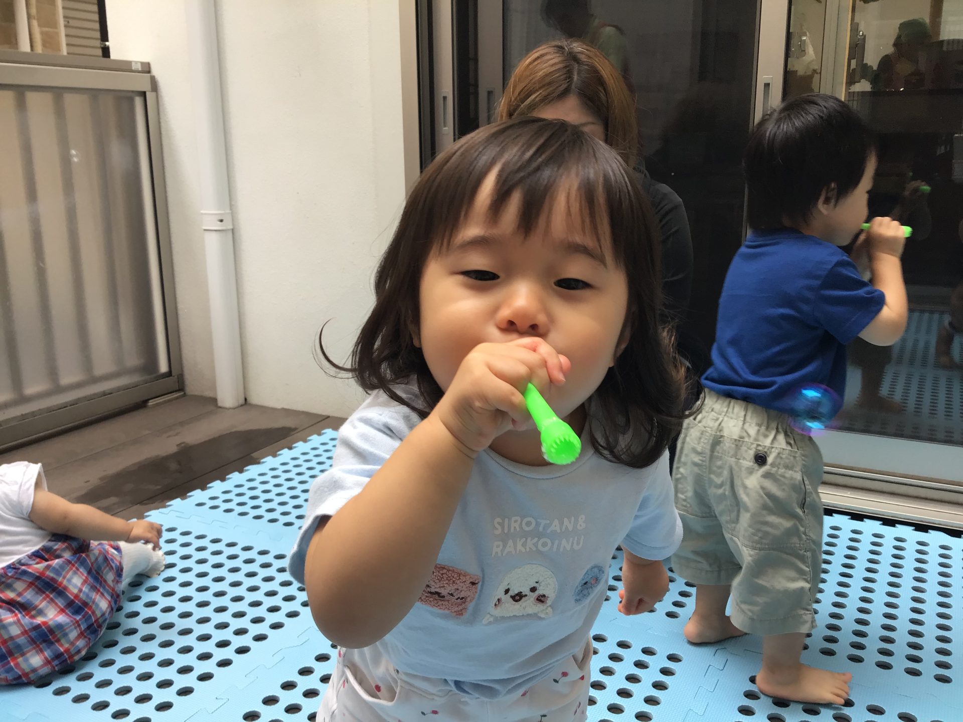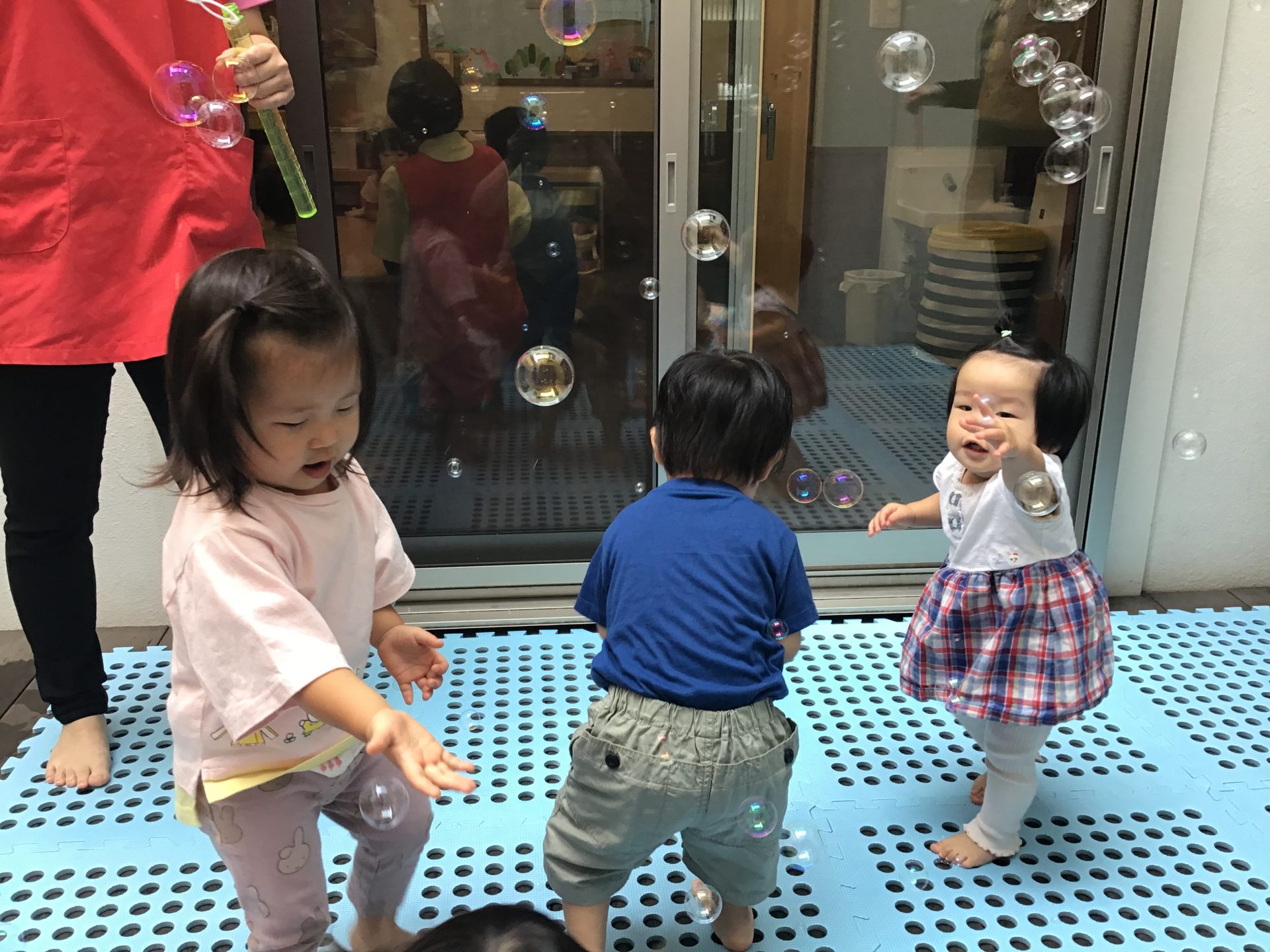 園のテラスでは秋の風を浴びながらシャボン玉を吹いて楽しんでいますよ🫧✨