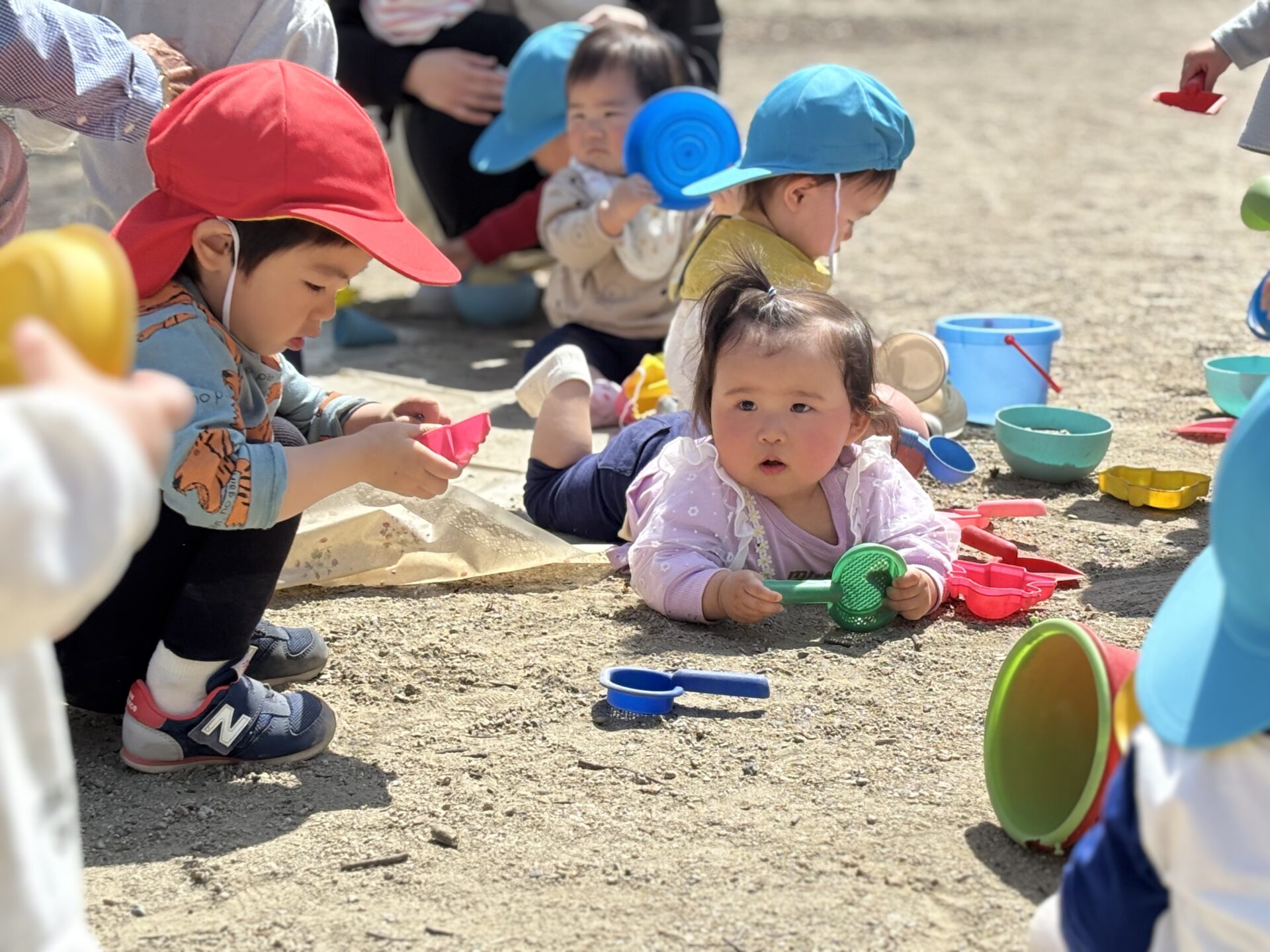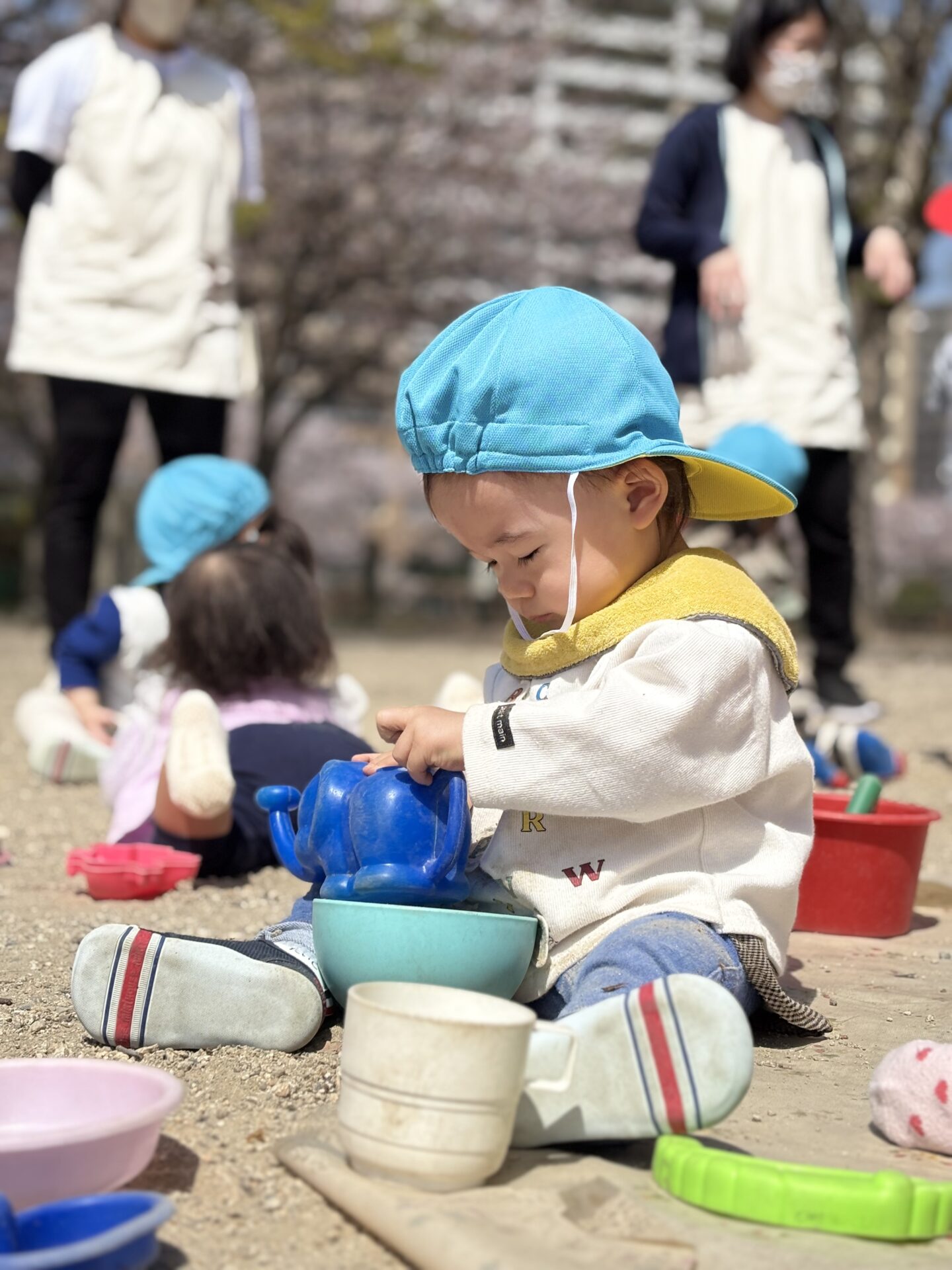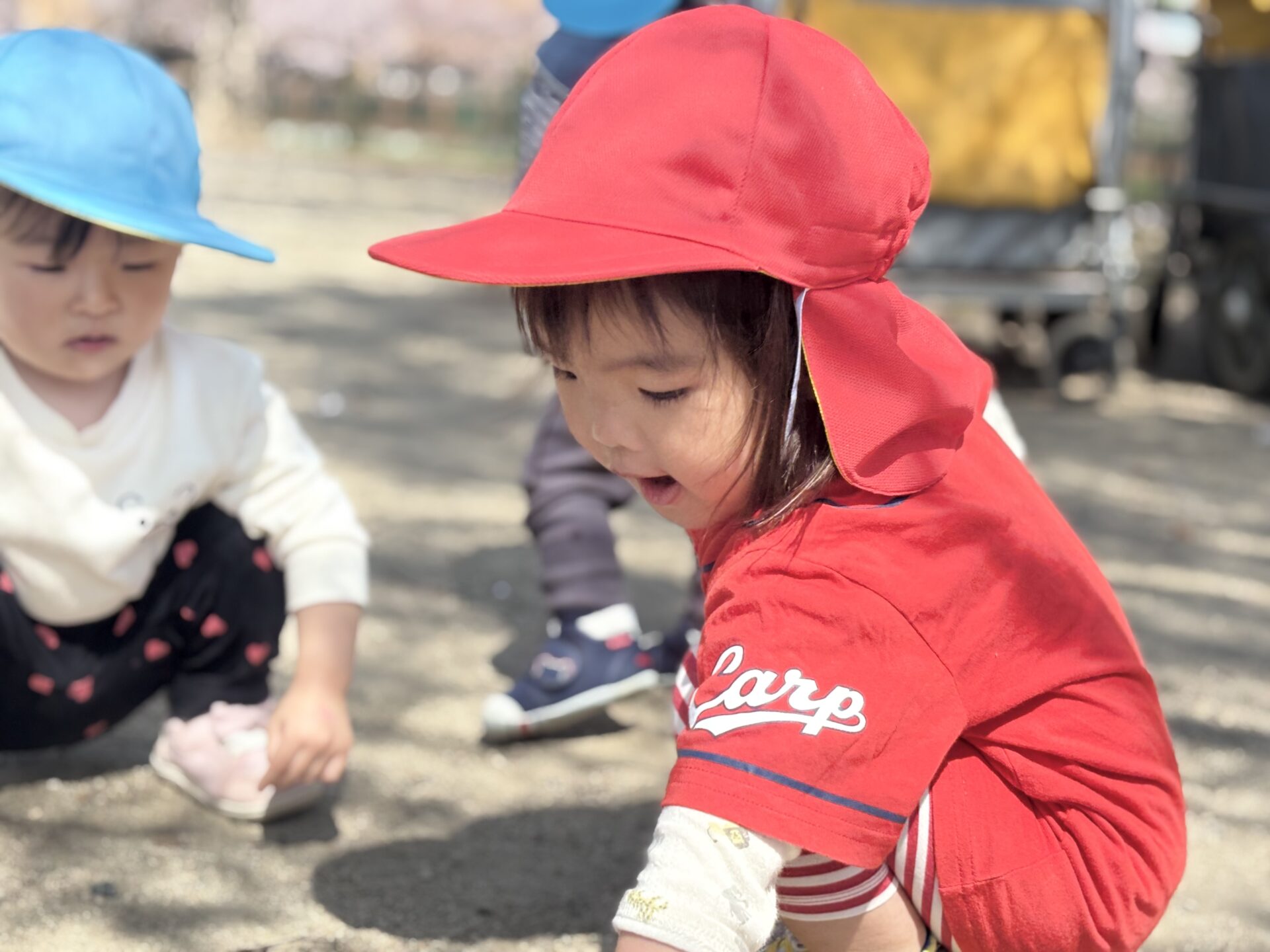 公園では、先生達と追いかけっこをしたり、砂遊びに夢中なったりと、